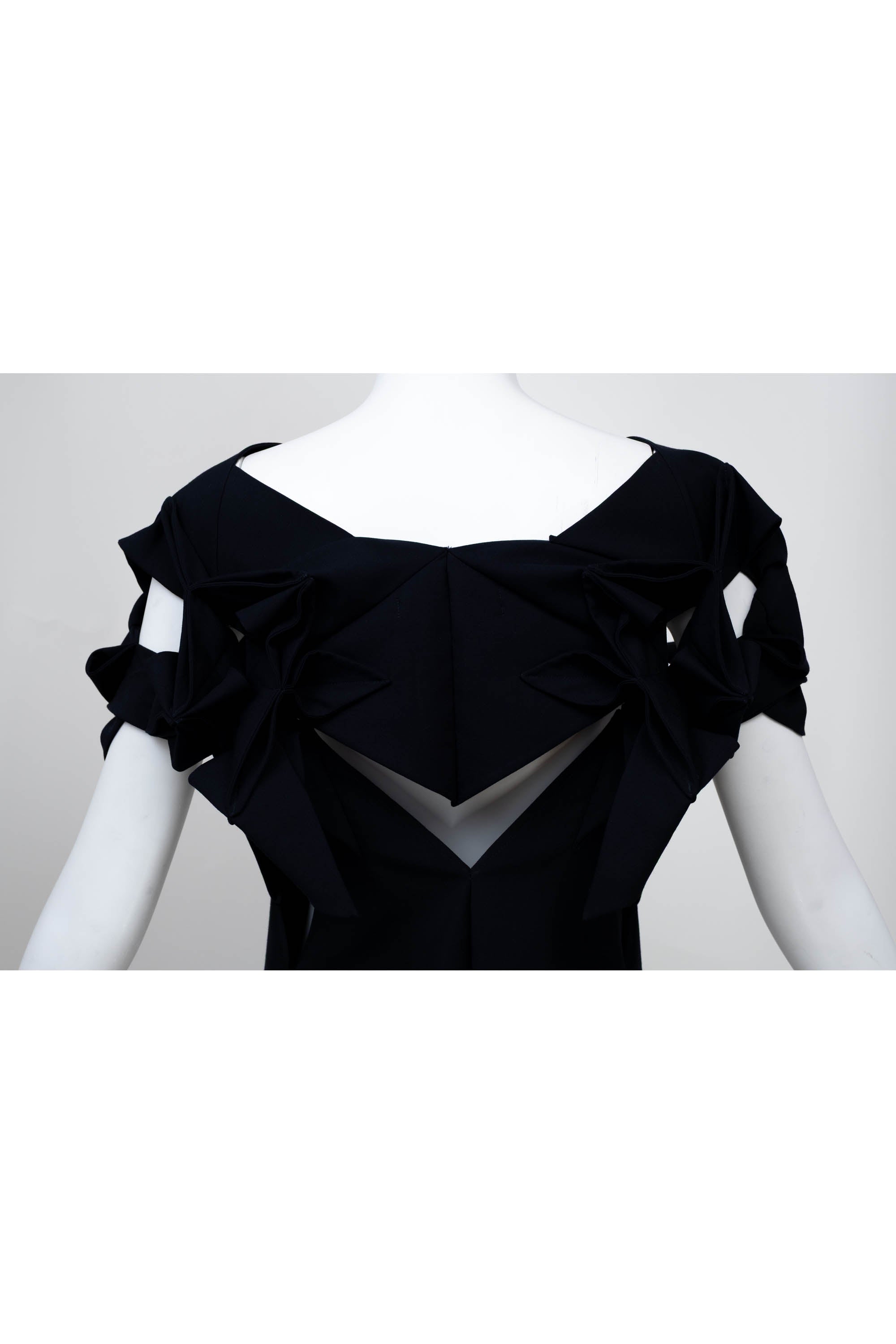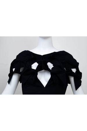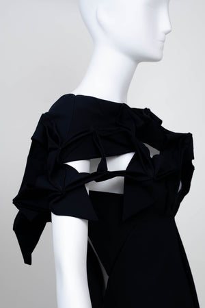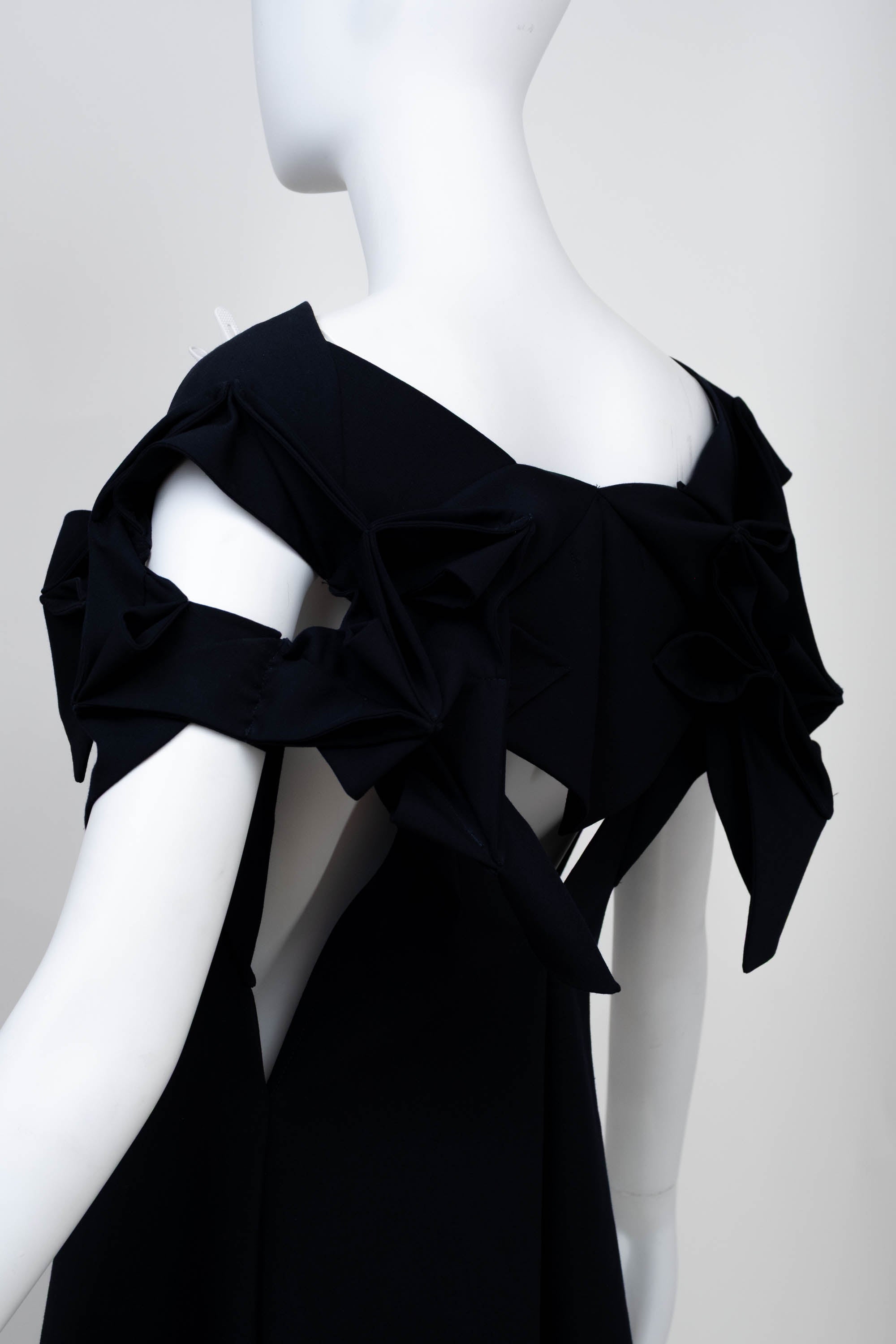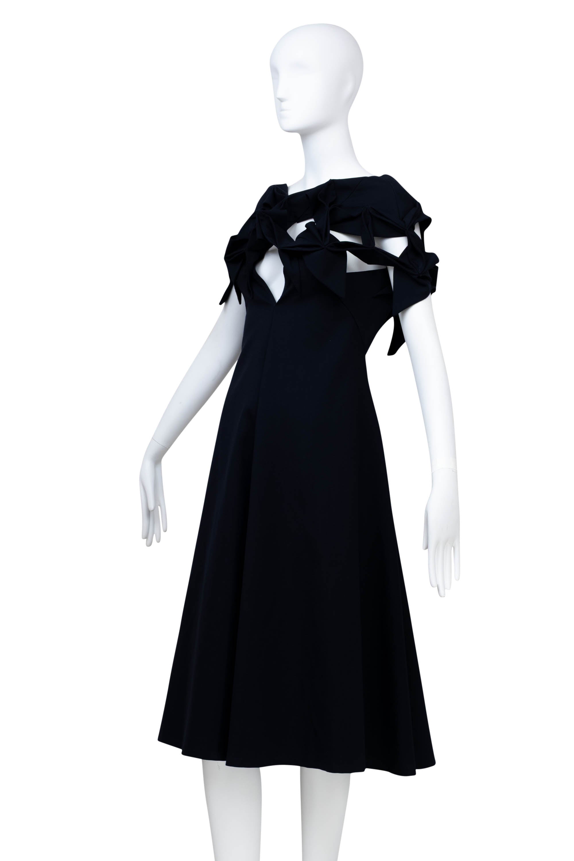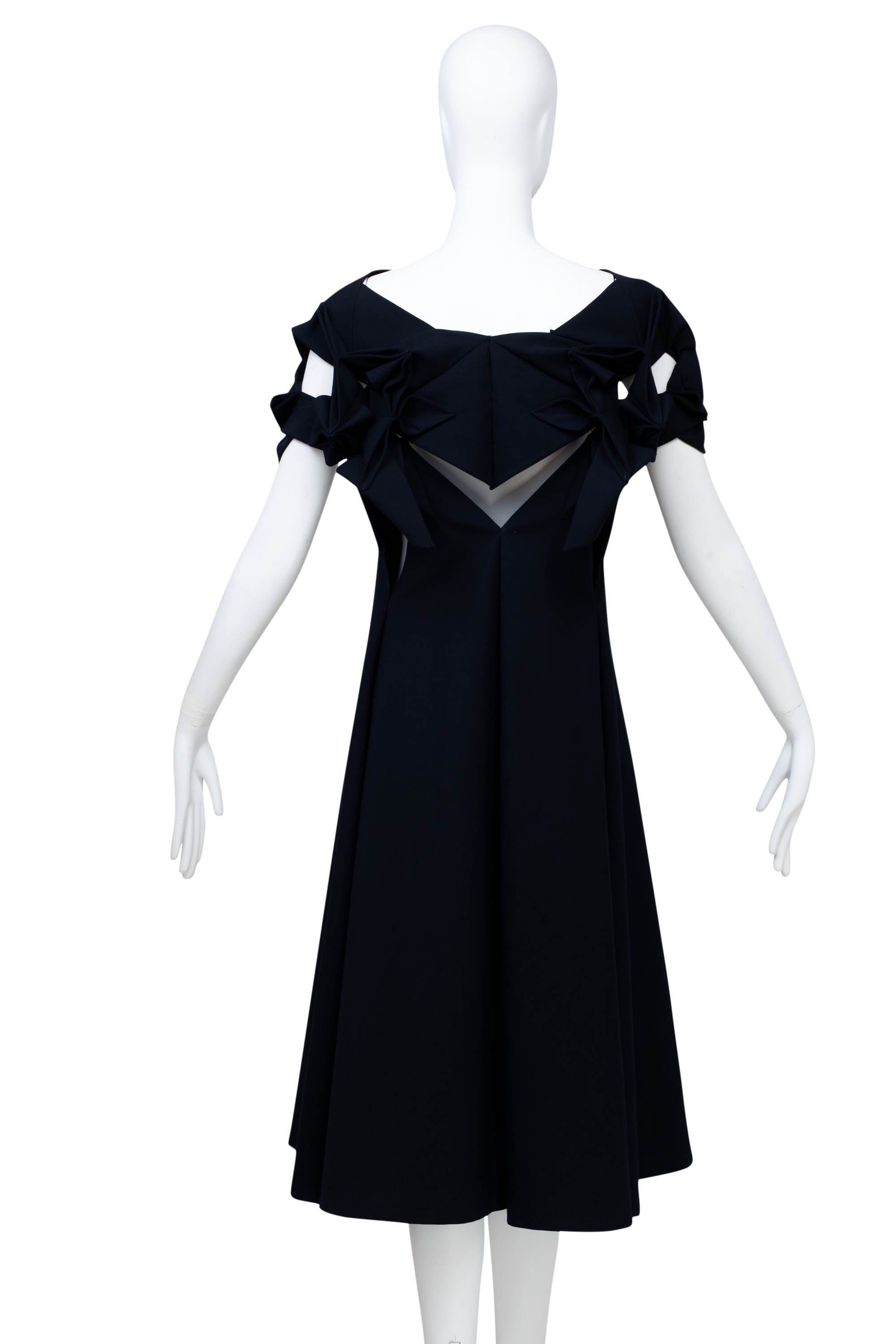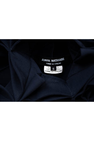Junya Watanabe Comme des Garcons Size Japan S Navy Origami Neckline Dress 2016. Classic A line silhouette with a unique shoulder line that resembles traditional origami folding techniques. It is constructed out of a wool and poly fabric in navy.