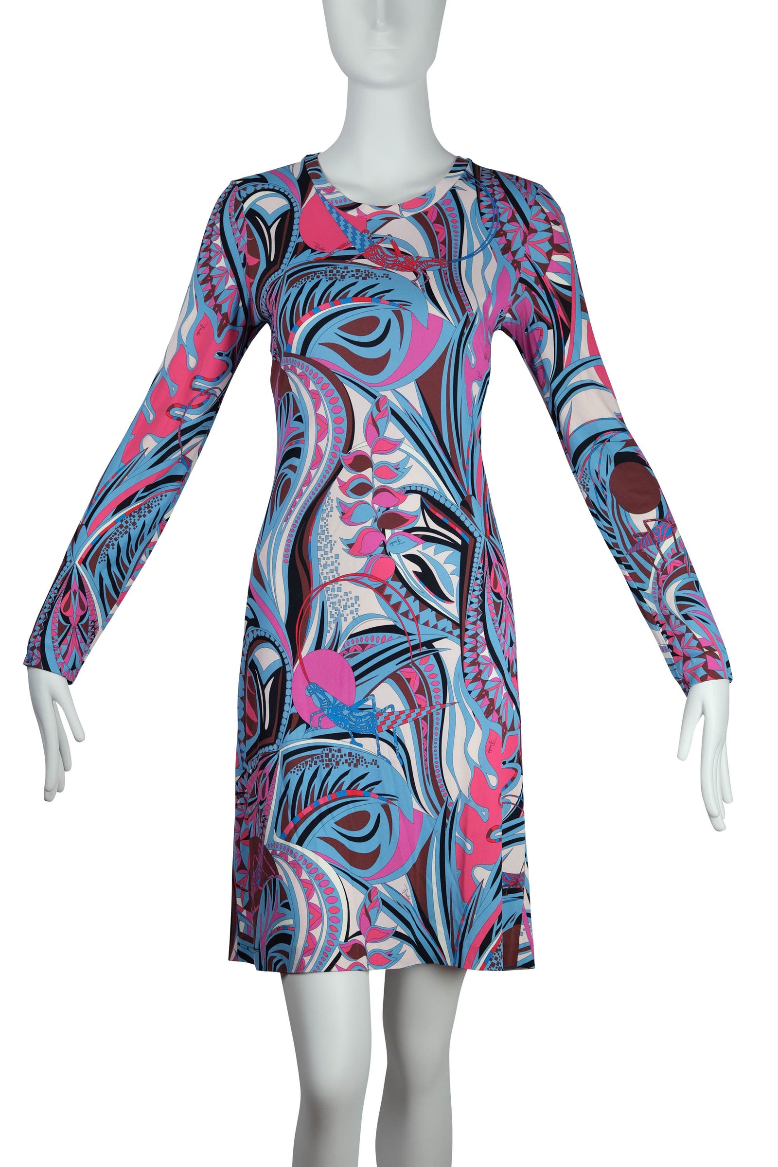 Emilio Pucci Pink Blue Long Sleeve Jersey Butterfly Grasshopper Print Dress Size 42/6.