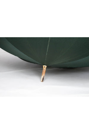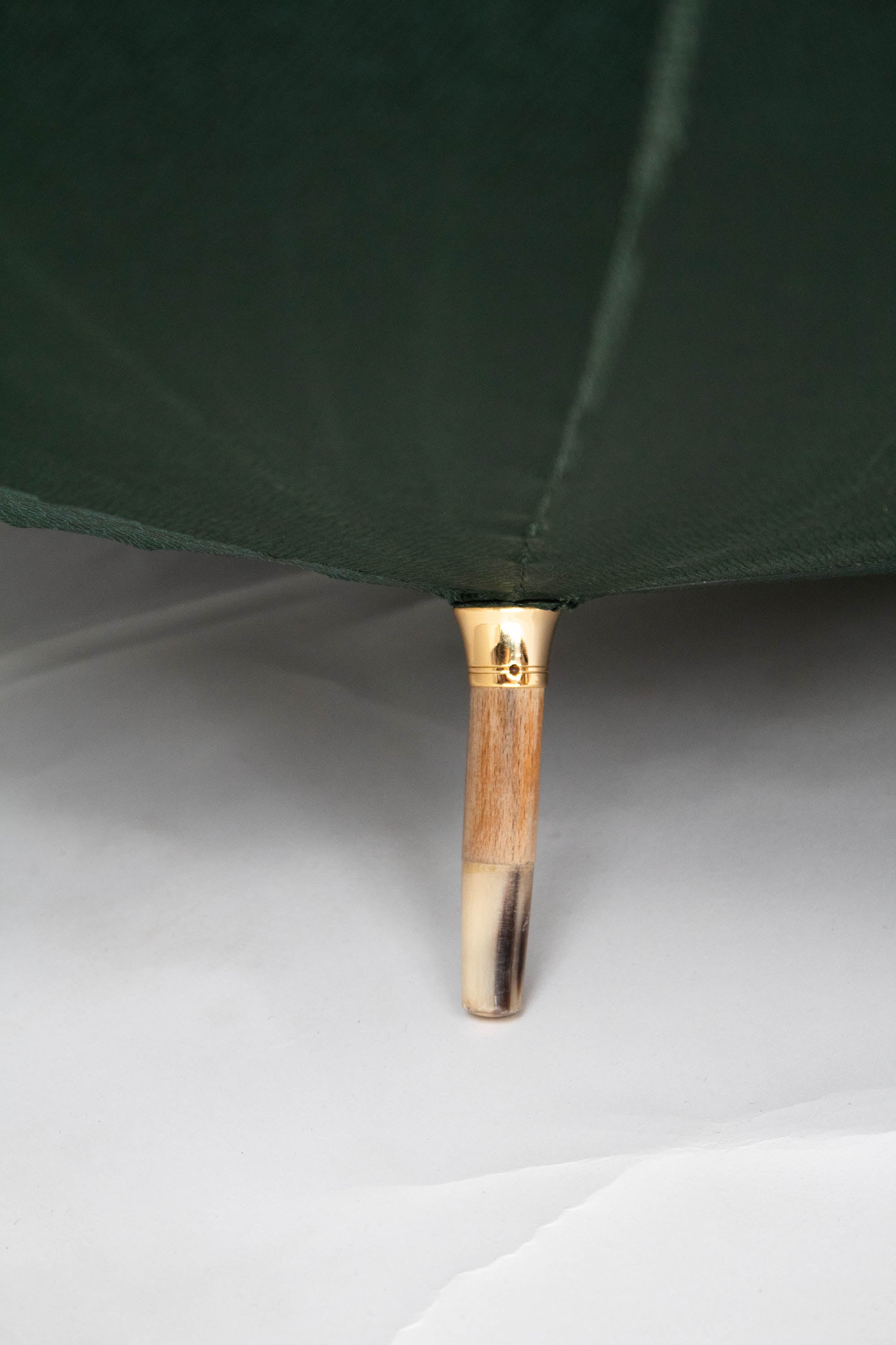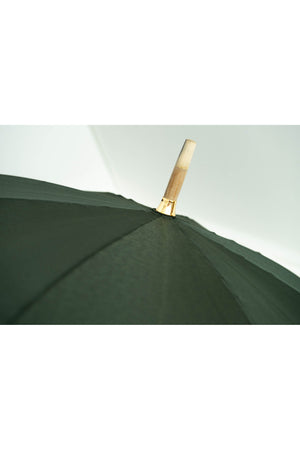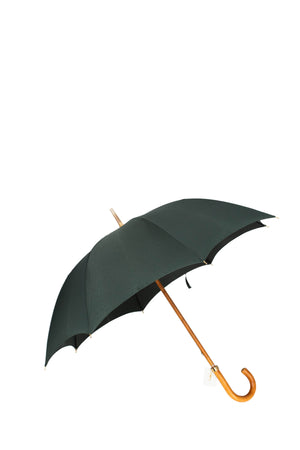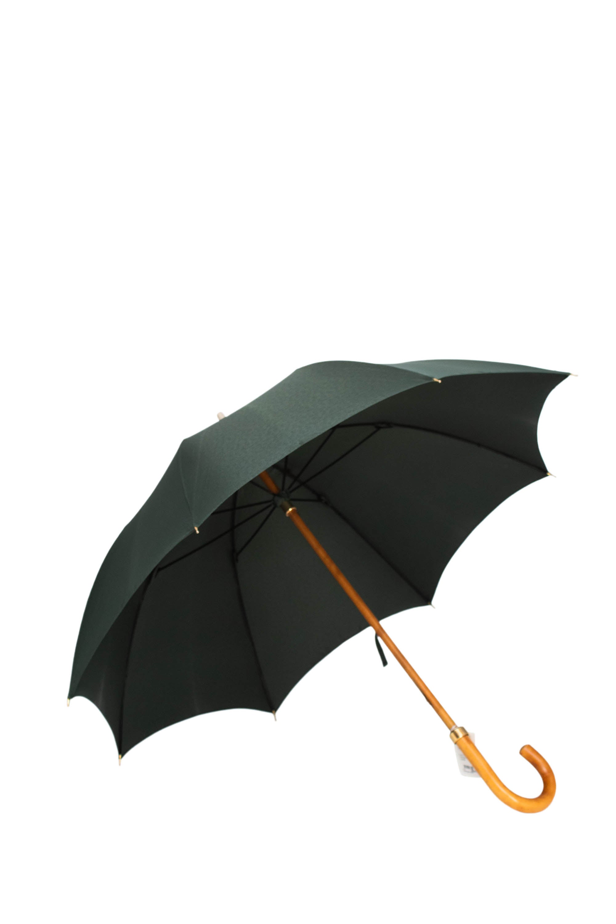 Louis Vuitton Green Taiga Umbrella With Wood Handle. Deep green taiga fabric umbrella canopy. Curved wooden handle. Gold tone hardware. Manual open and close. Horn detail on top of the umbrella.