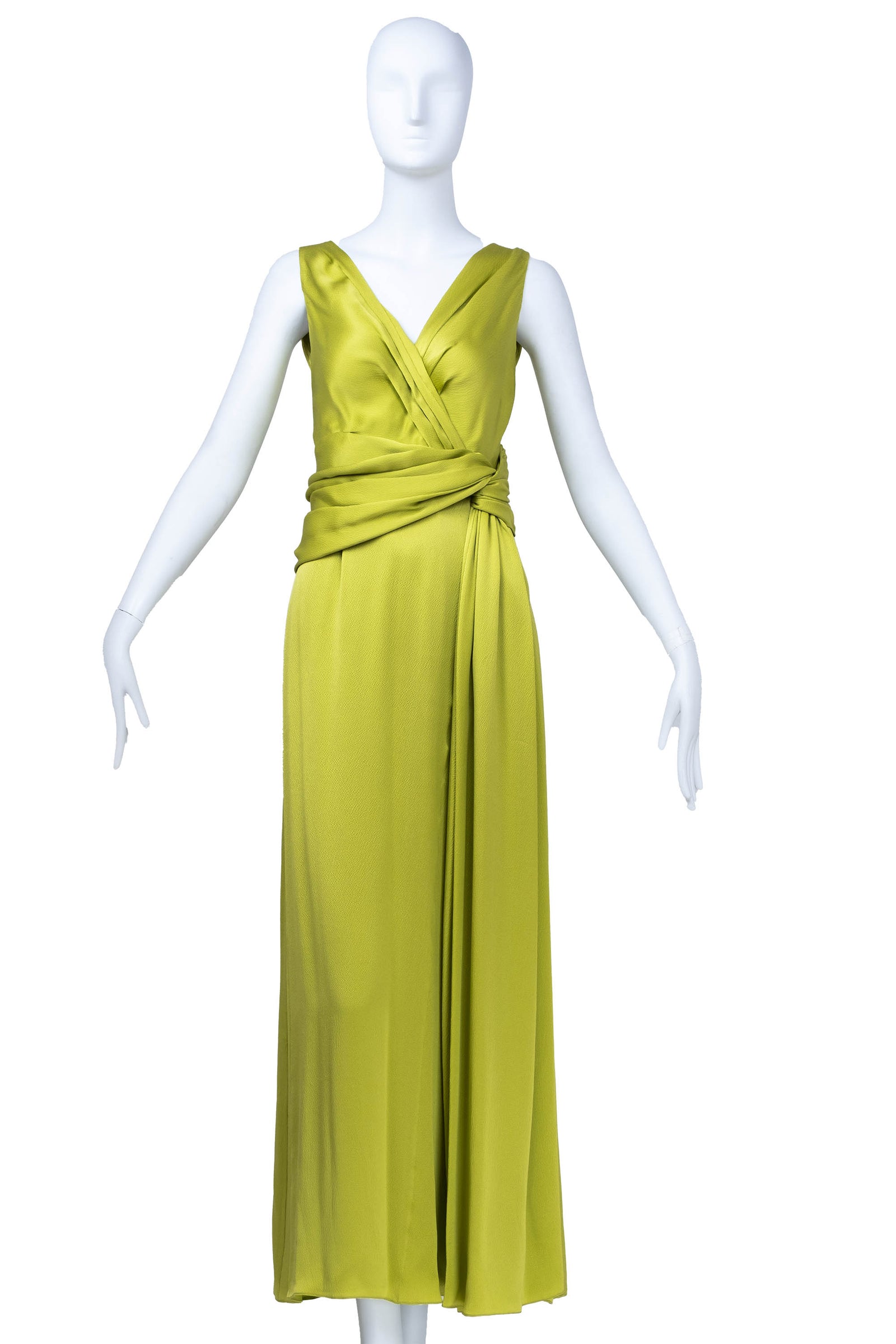 Christian Dior Galliano Chartreuse Hammered Silk Draped Gown f/w 2007 Size 6