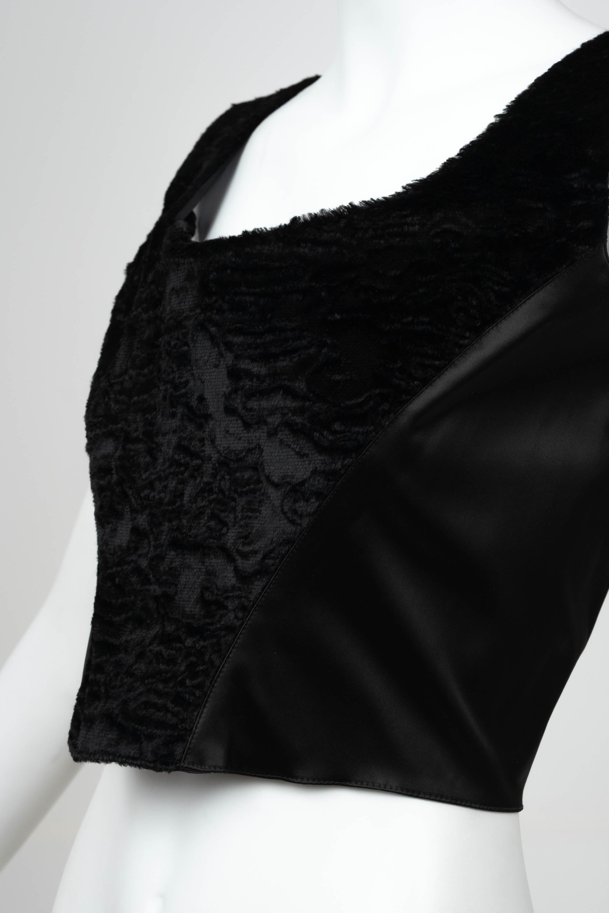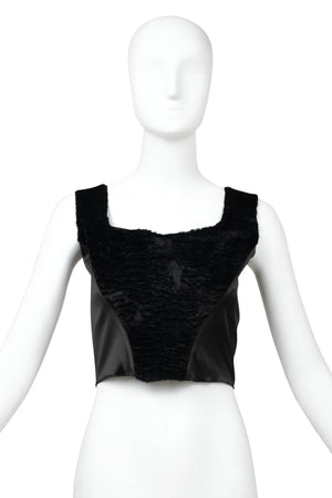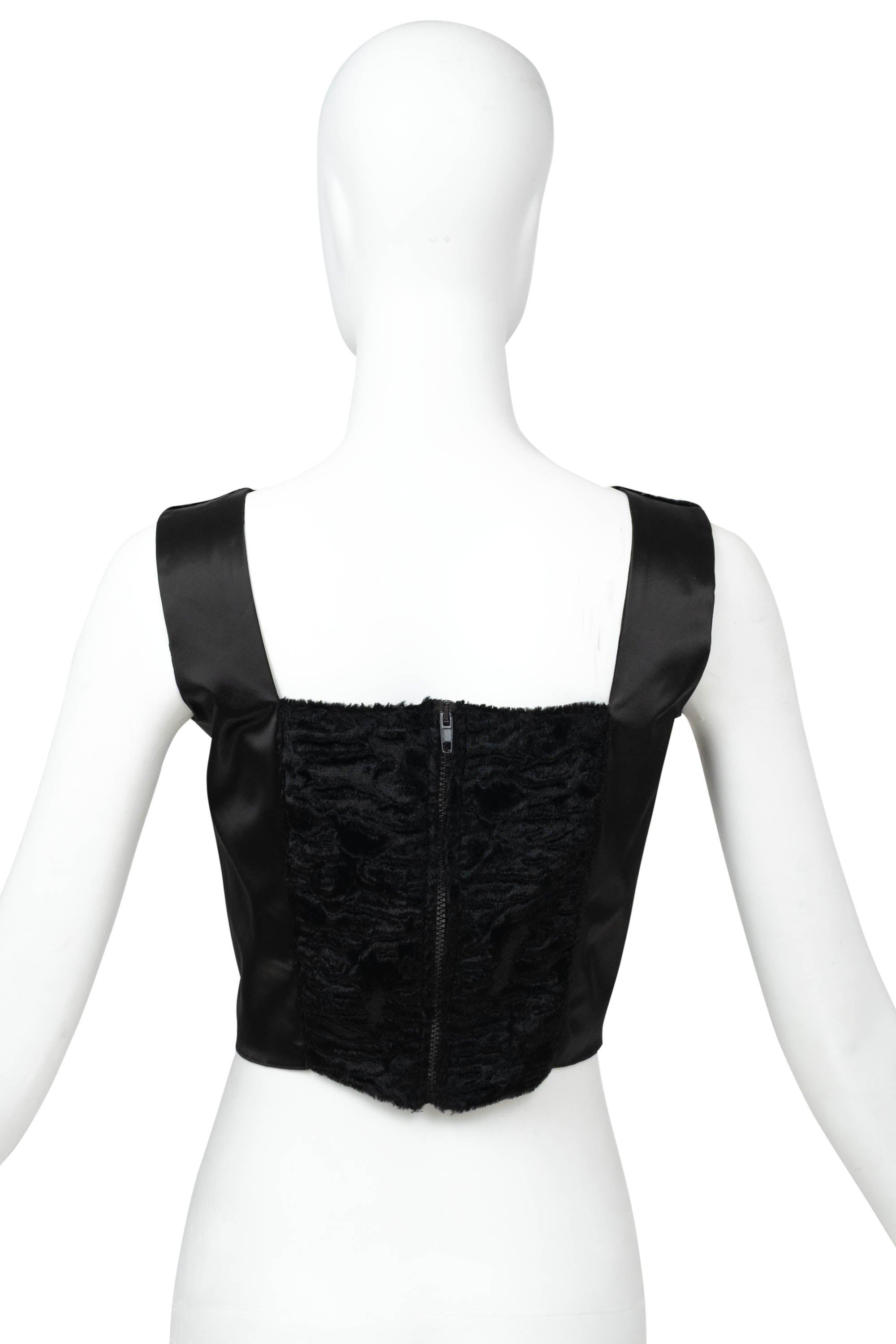 Blumarine Black Satin Faux Fur Bustier Size 42. Black satin bustier with faux fur paneling at front. Structured bodice with contoured seam. Cropped length with a fitted, corset shape. Textural contrast. Perfect for evening styling or layered looks.