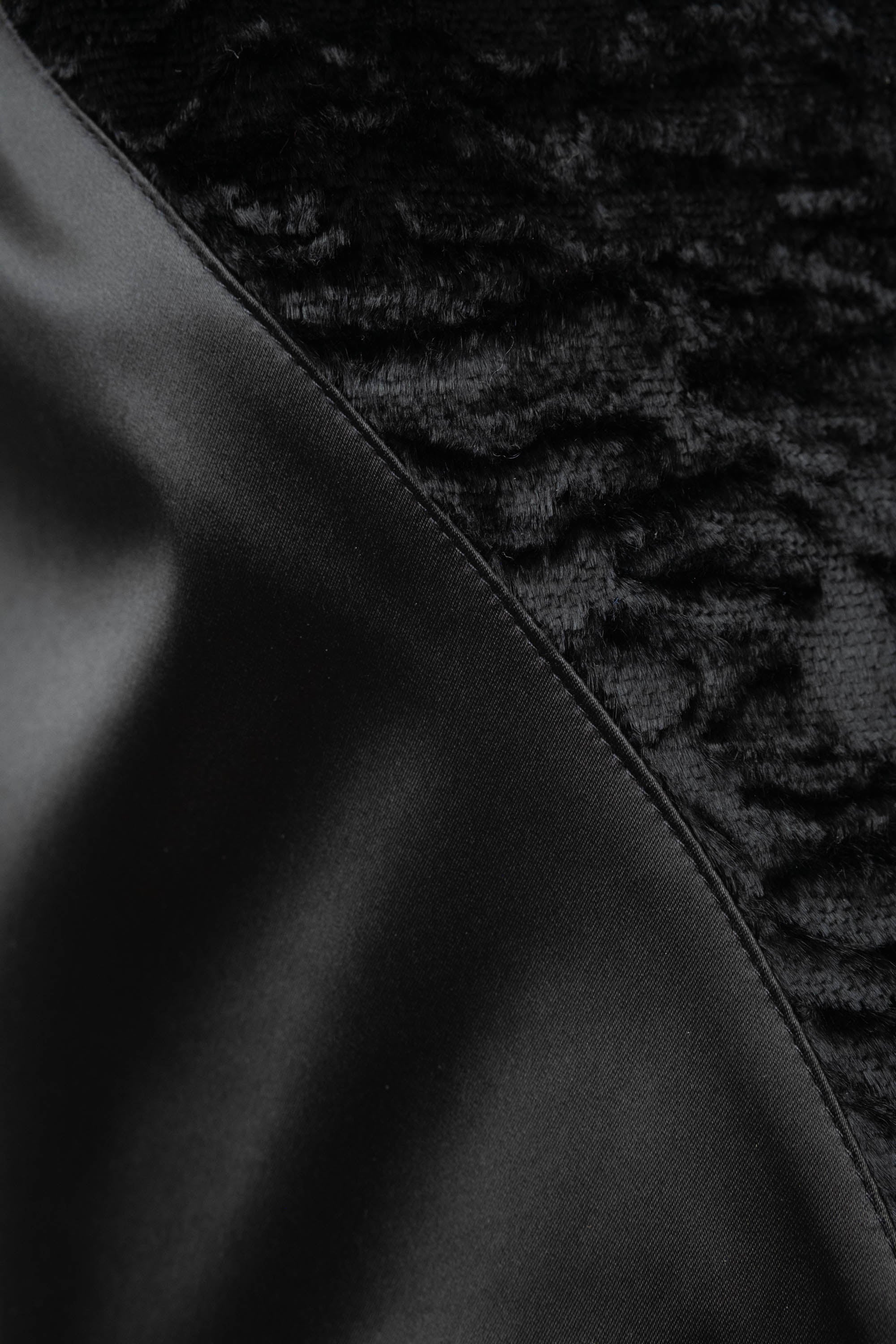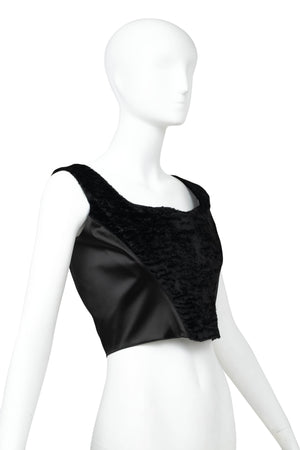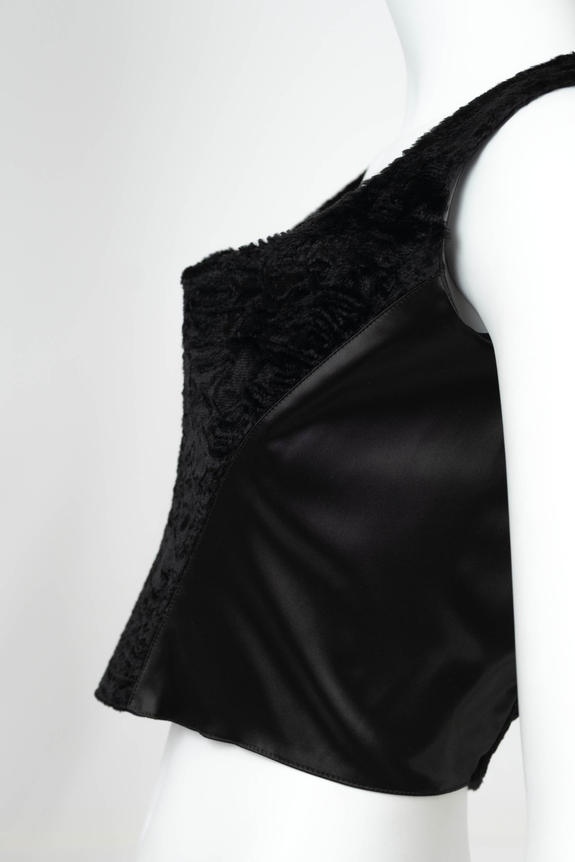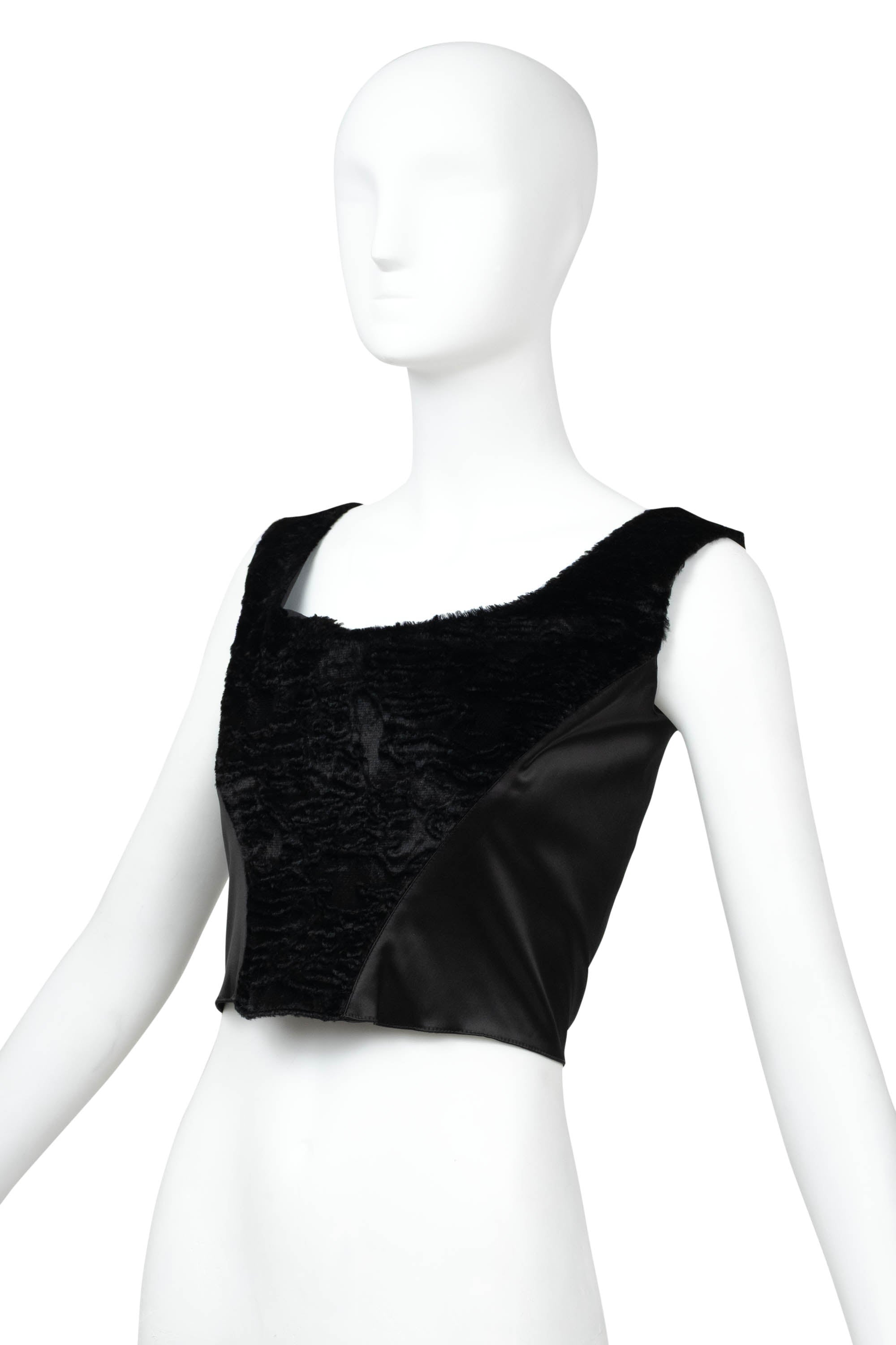 Blumarine Black Satin Faux Fur Bustier Size 42. Black satin bustier with faux fur paneling at front. Structured bodice with contoured seam. Cropped length with a fitted, corset shape. Textural contrast. Perfect for evening styling or layered looks.