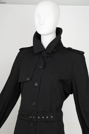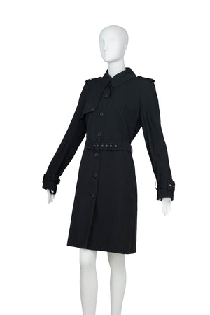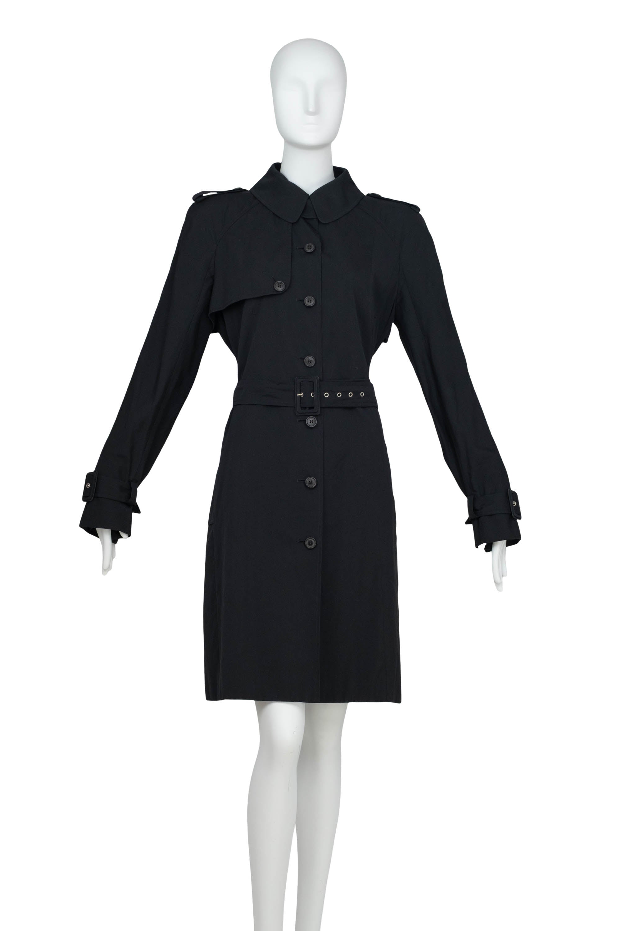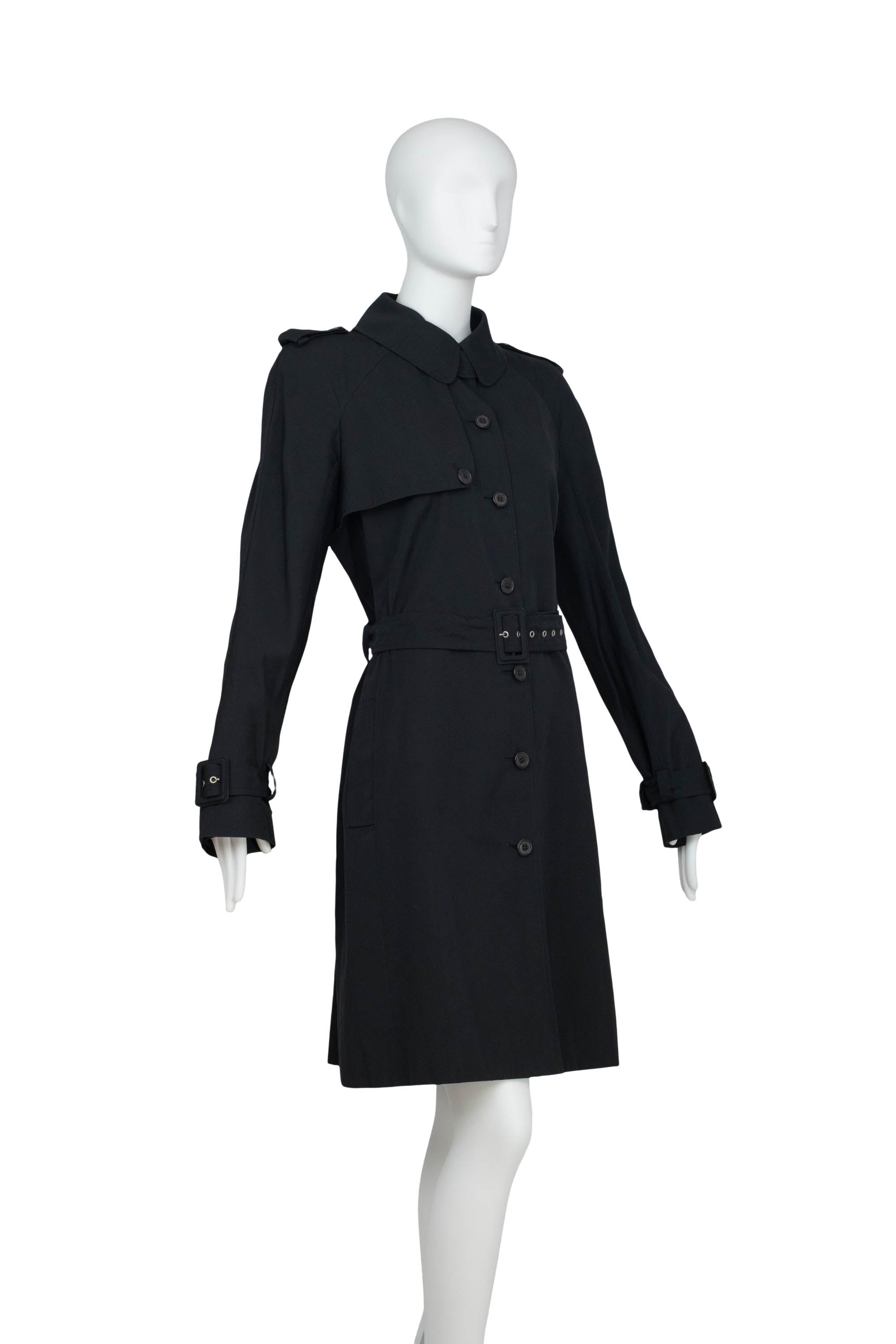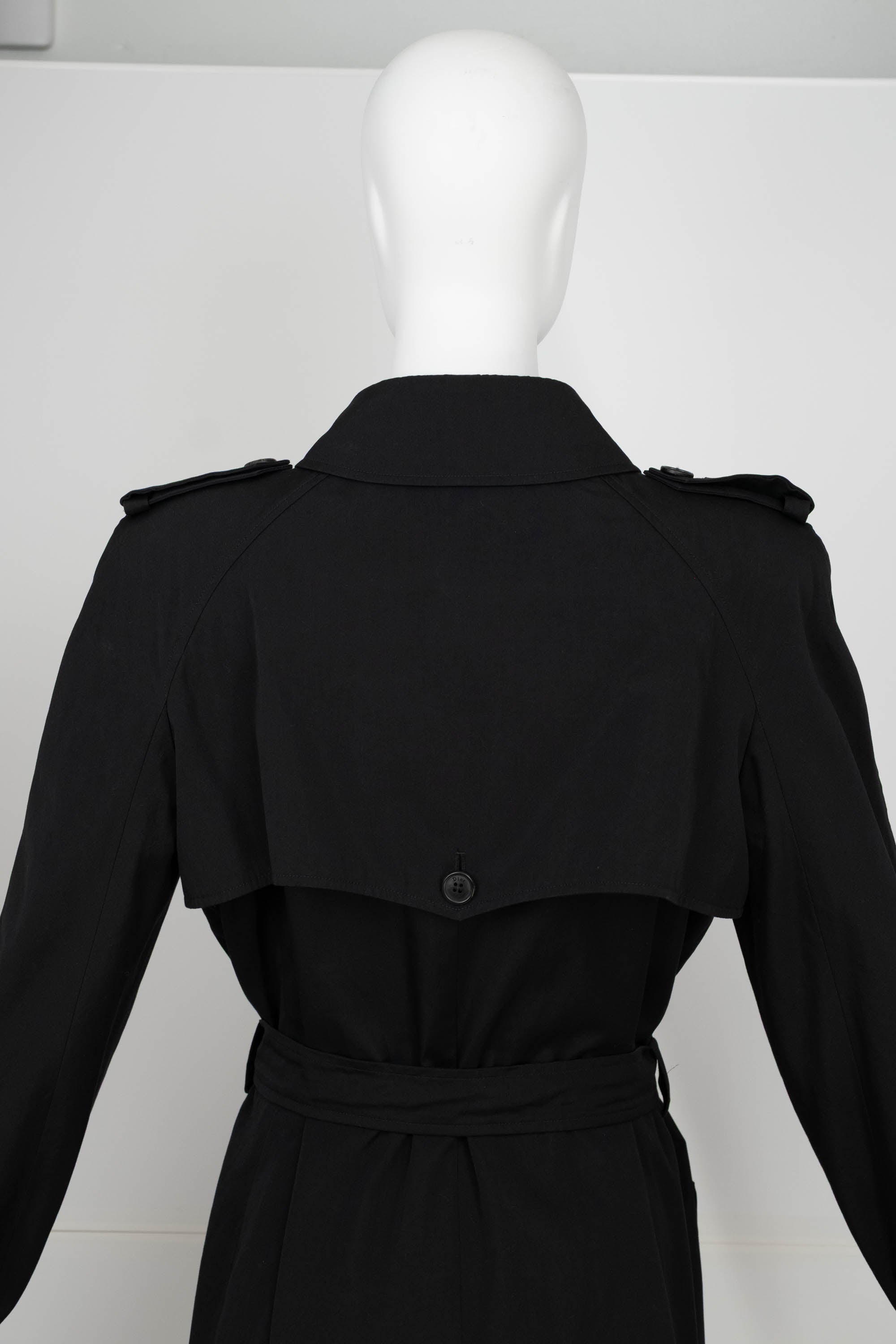 Christian Dior Vintage Black Trench Coat Size 44/10. Timeless outerwear piece. Classic black trench silhouette. Shoulders feature epaulettes. Adjustable waist belt for tailored fit. Mid length.