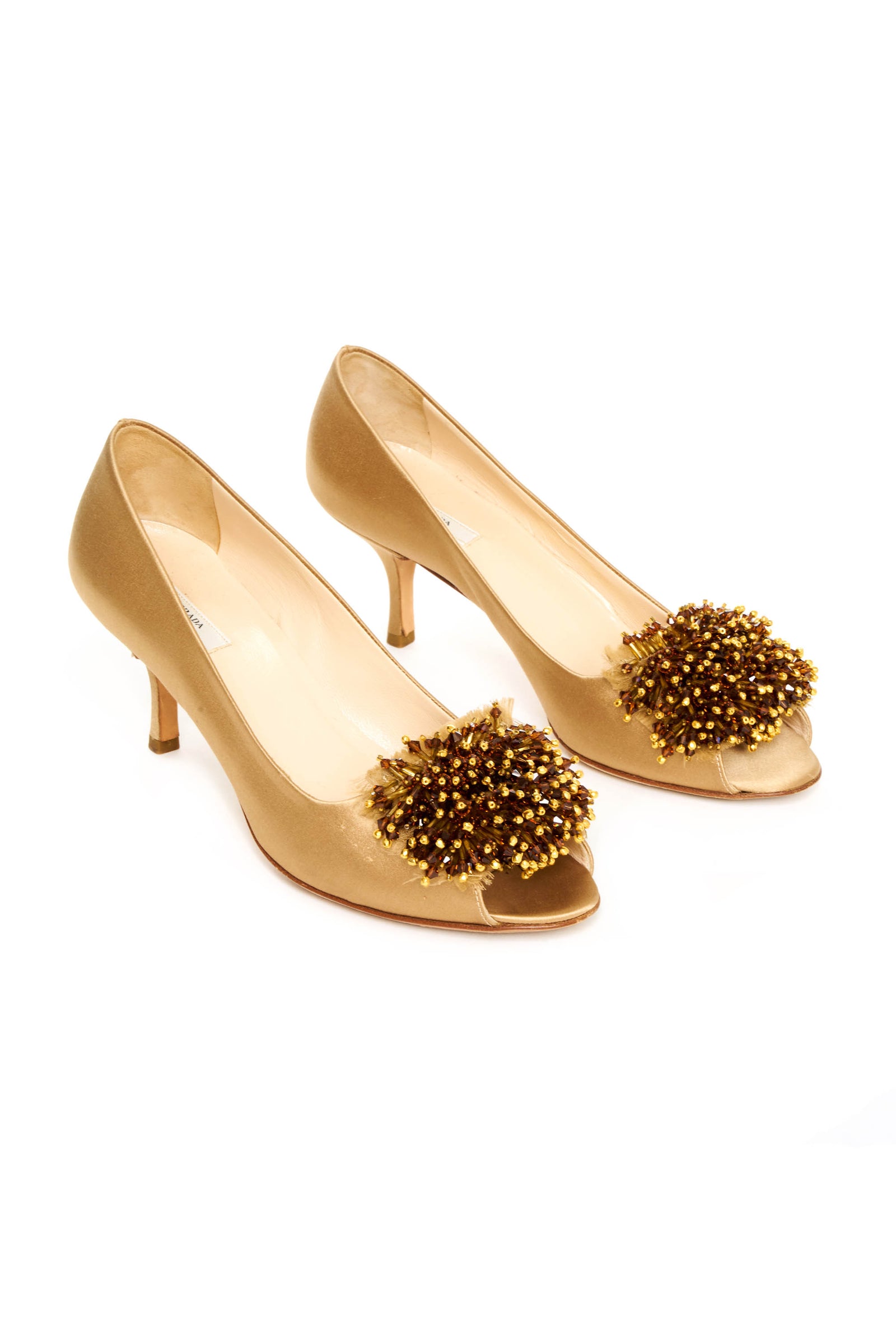 Prada Champagne Satin Gold Pom Peep Toe Heel Size 38.5