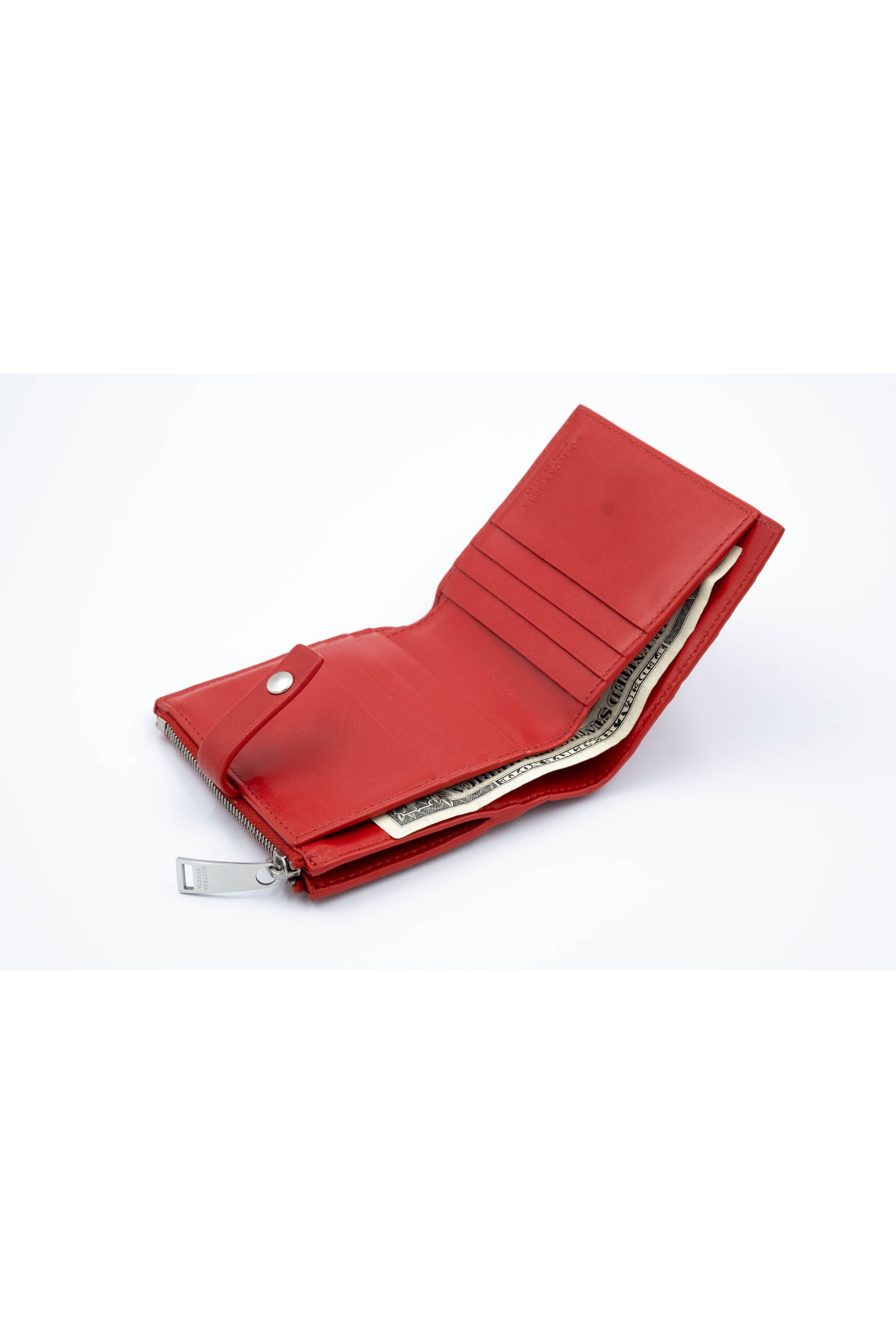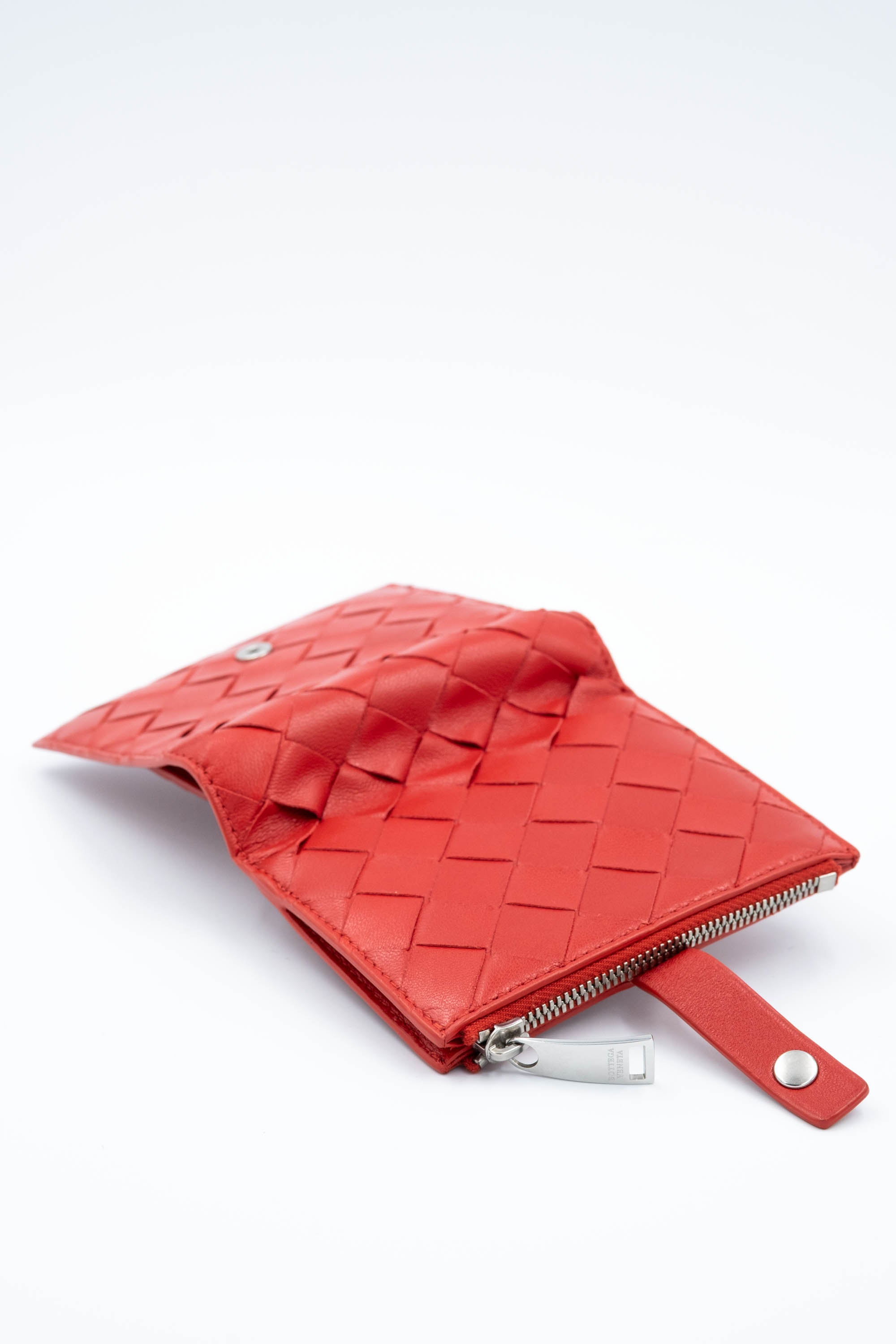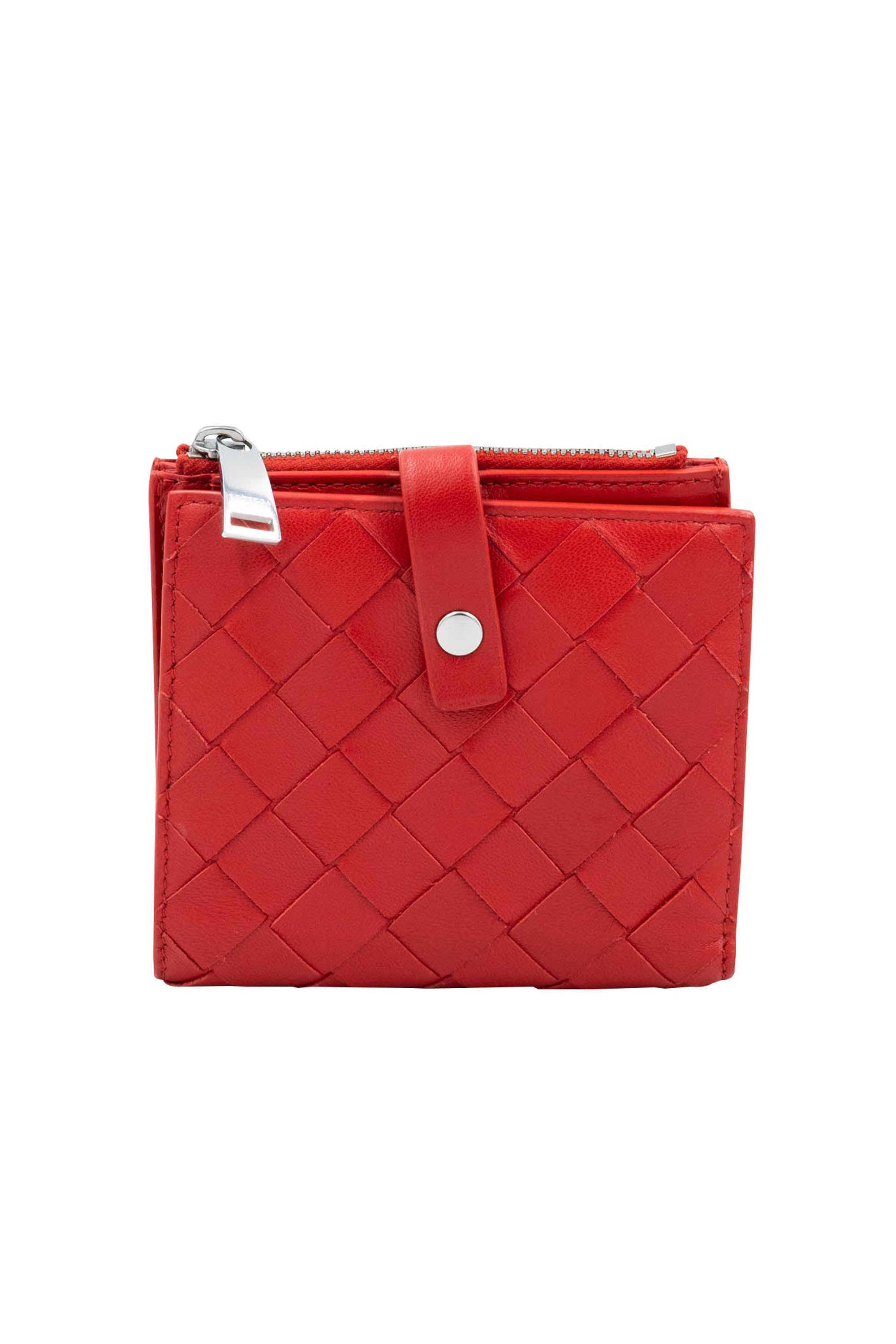 Bottega Veneta Red Square Med Weave Intrecciato Wallet Size Small. Woven intrecciato leather in a bold red. Silver tone snap closure with compact interior layout. Bill fold style.