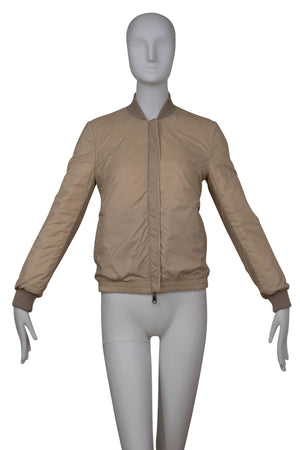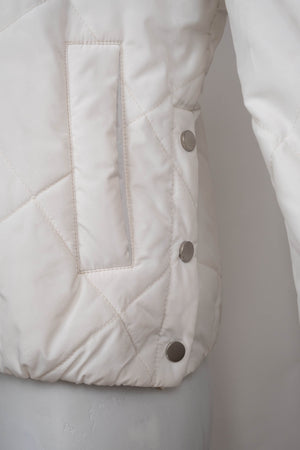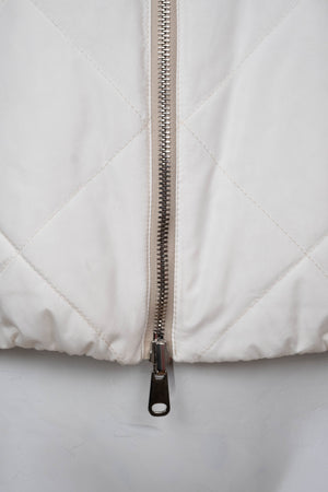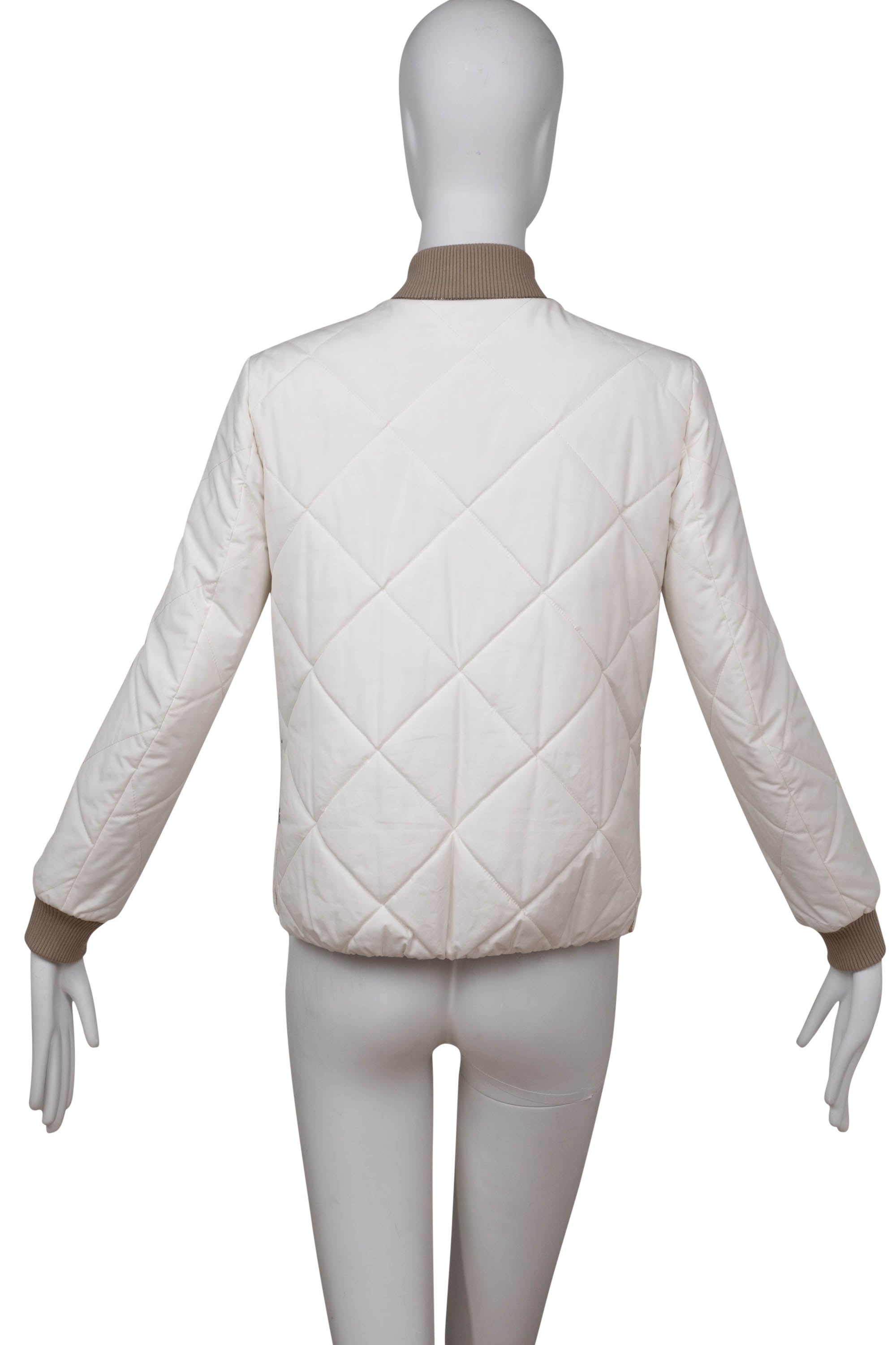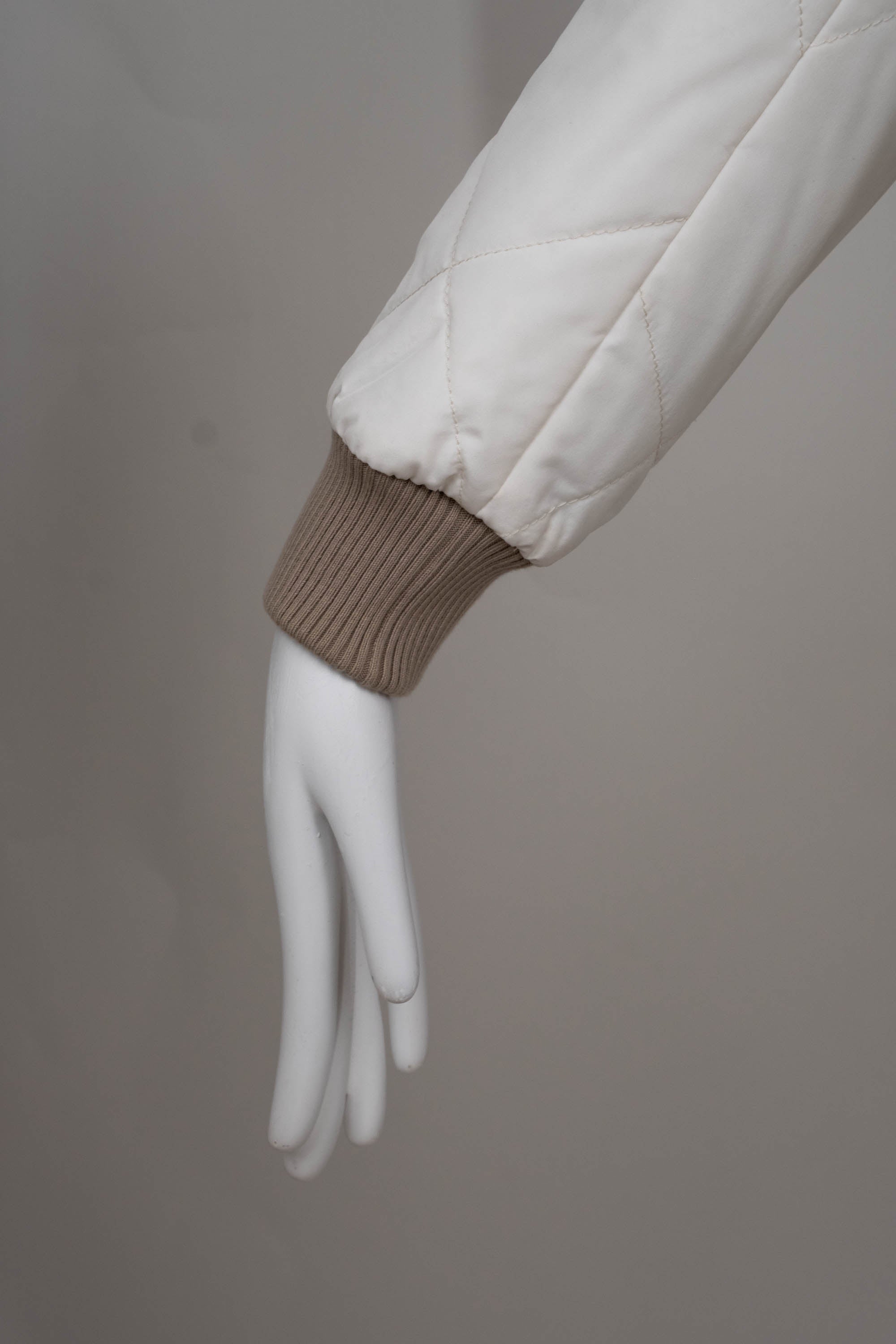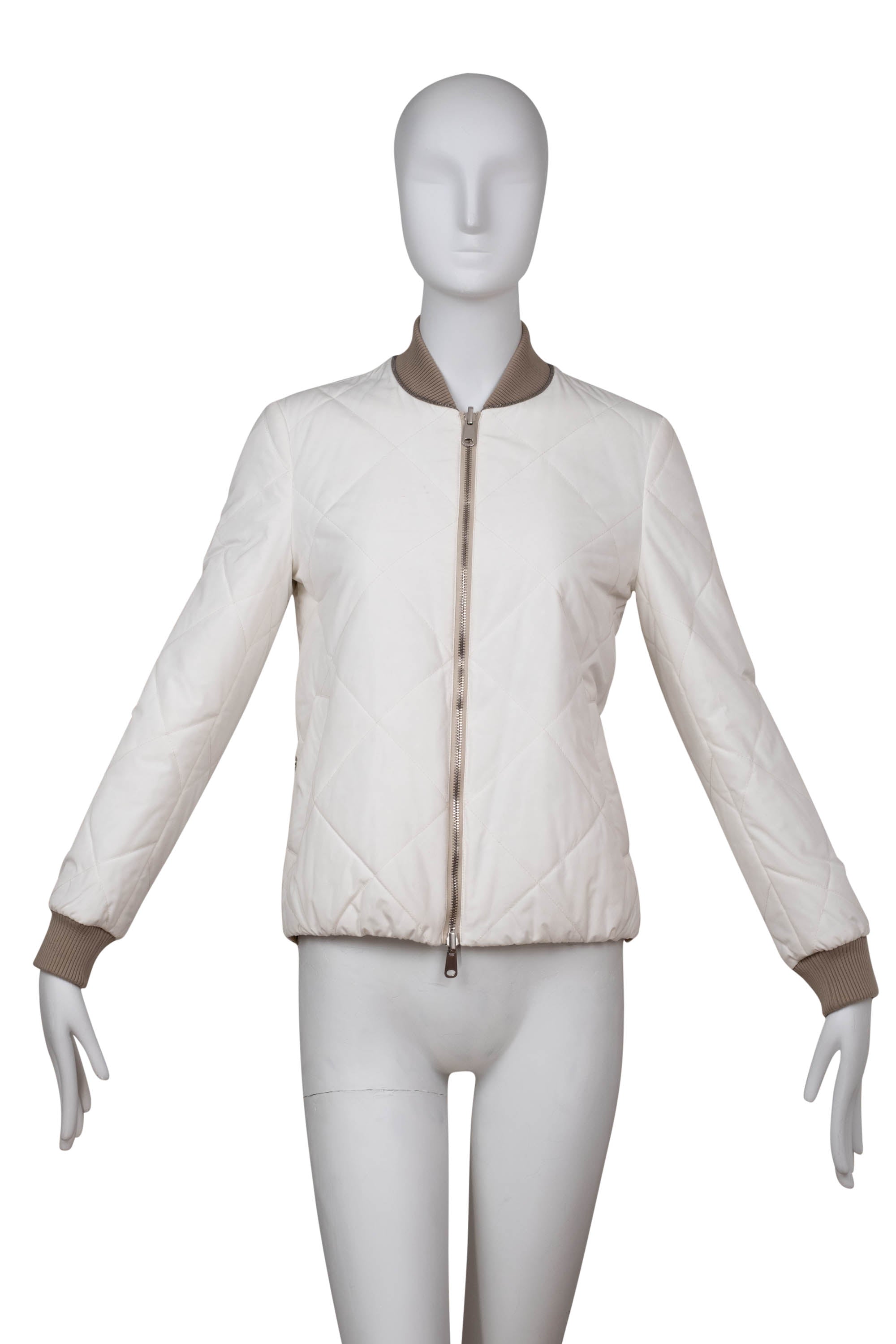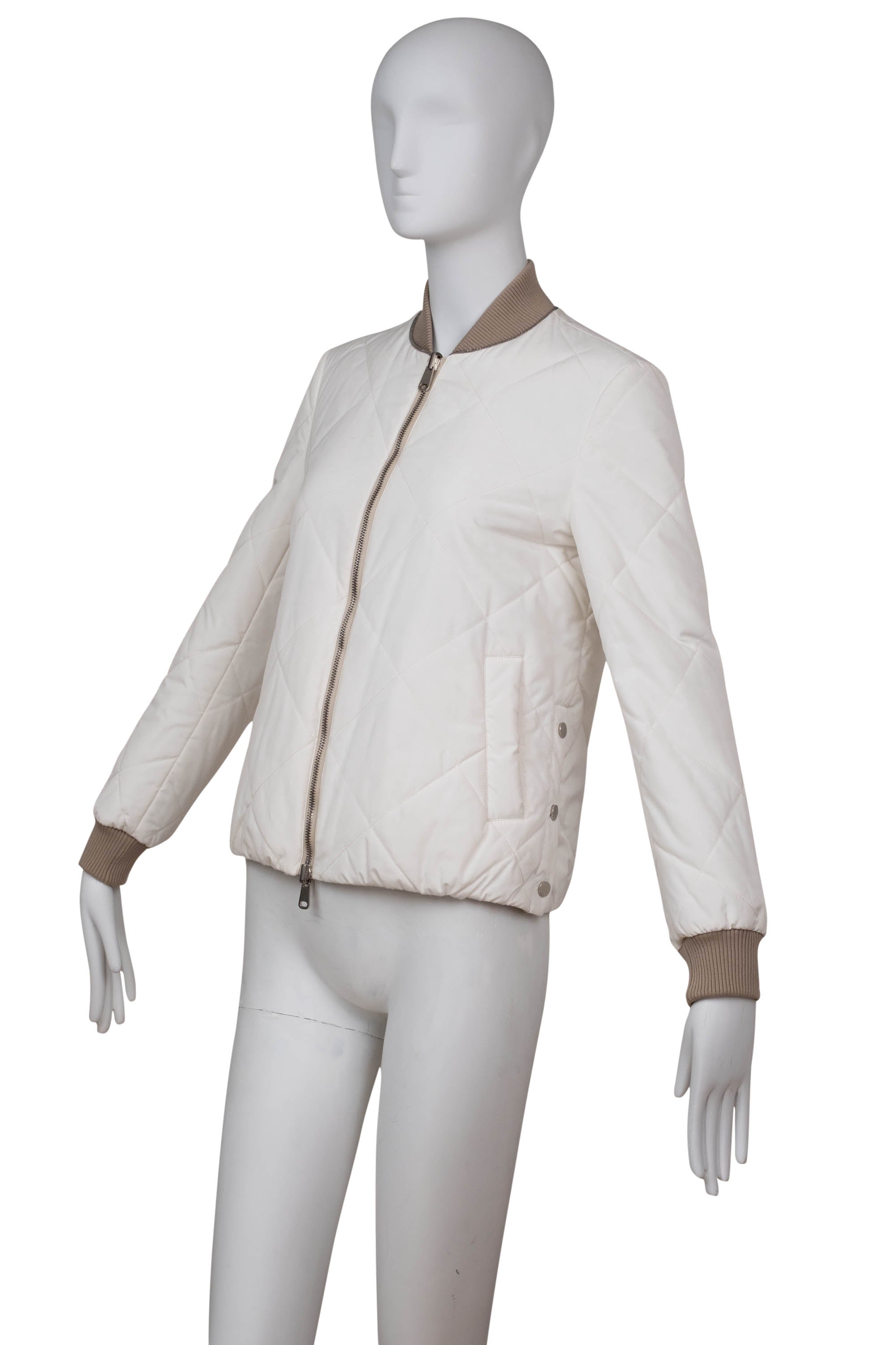 Brunello Cucinelli White Beige Reversible Quilted Bomber Jacket Size 38. Bomber style jacket. White exterior with beige lining. Jacket is fully reversable. Zipper and side snap closure.