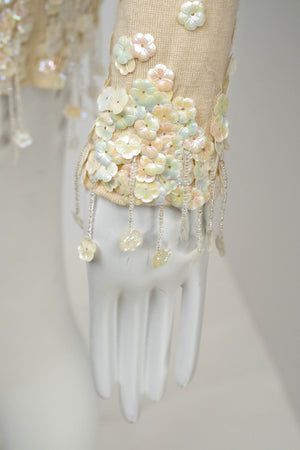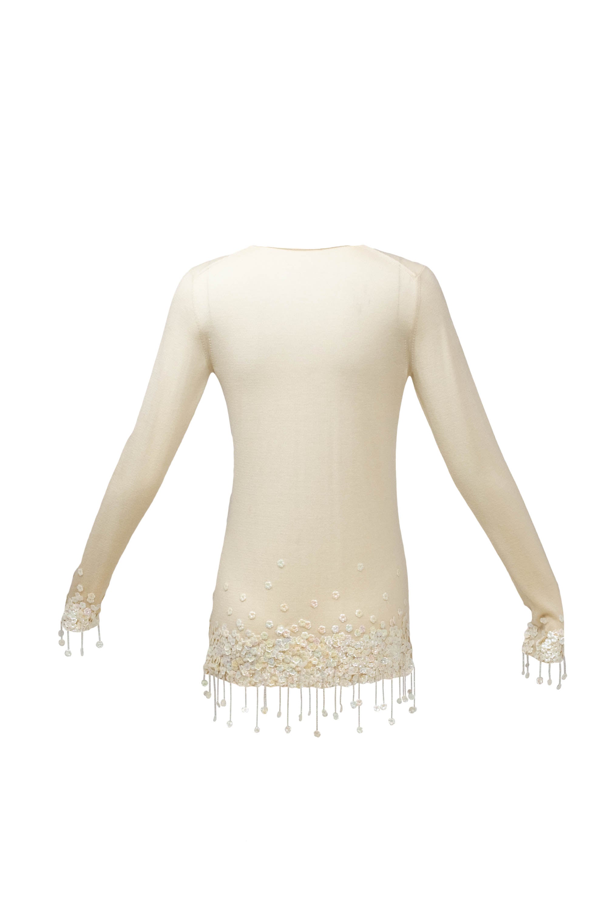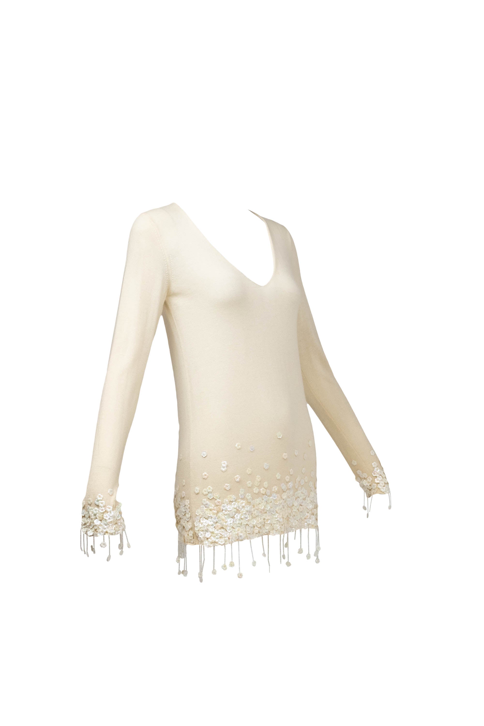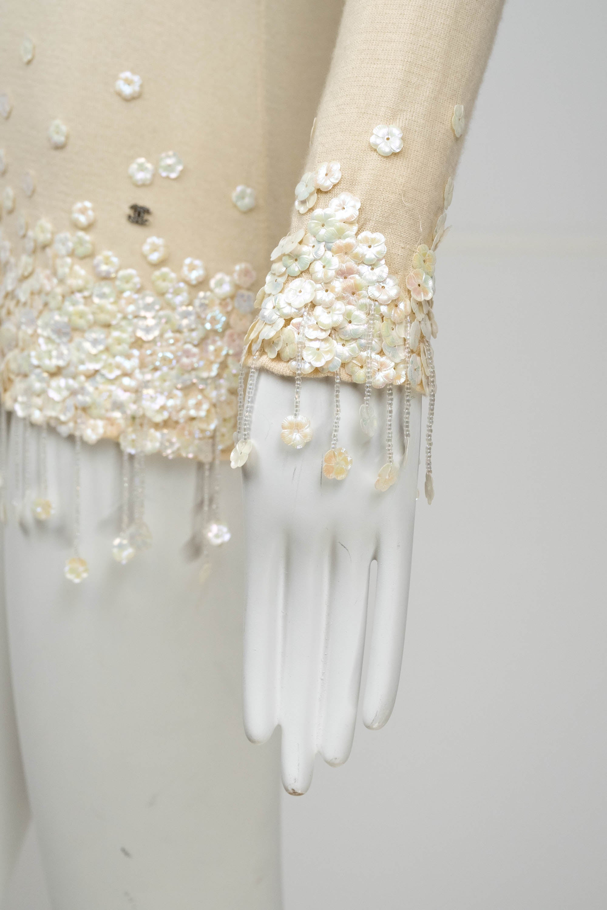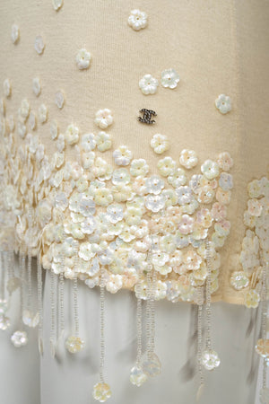 Chanel Ivory Sweater With white Flower Sequins Size S/M. Soft ivory knit with delicate floral sequins. Subtle fringe and textural detailing at hem and cuffs. Elegant, feminine take on a classic sweater.