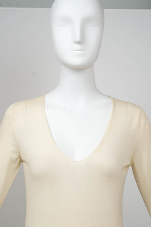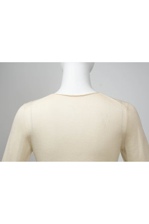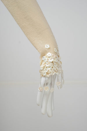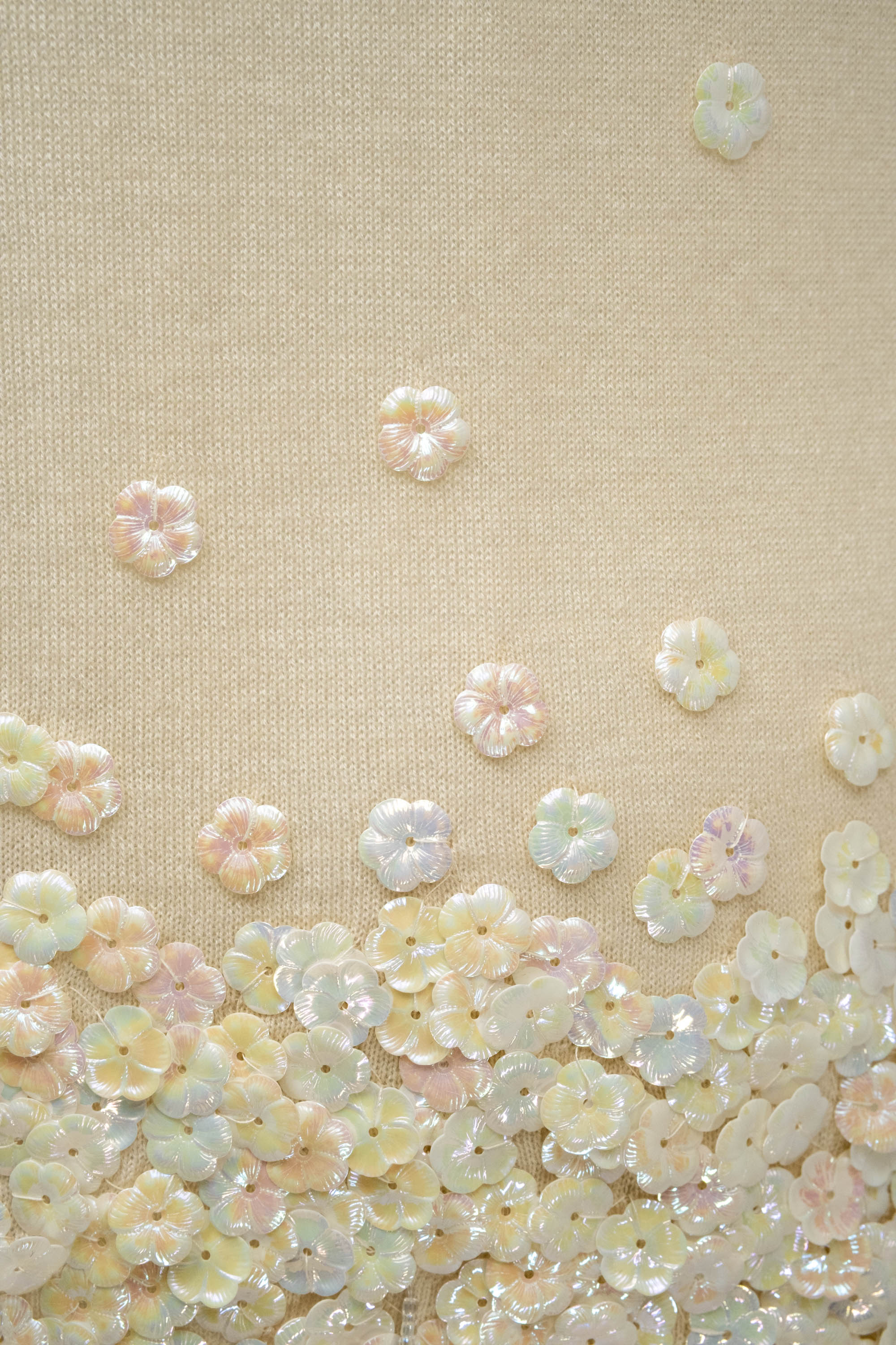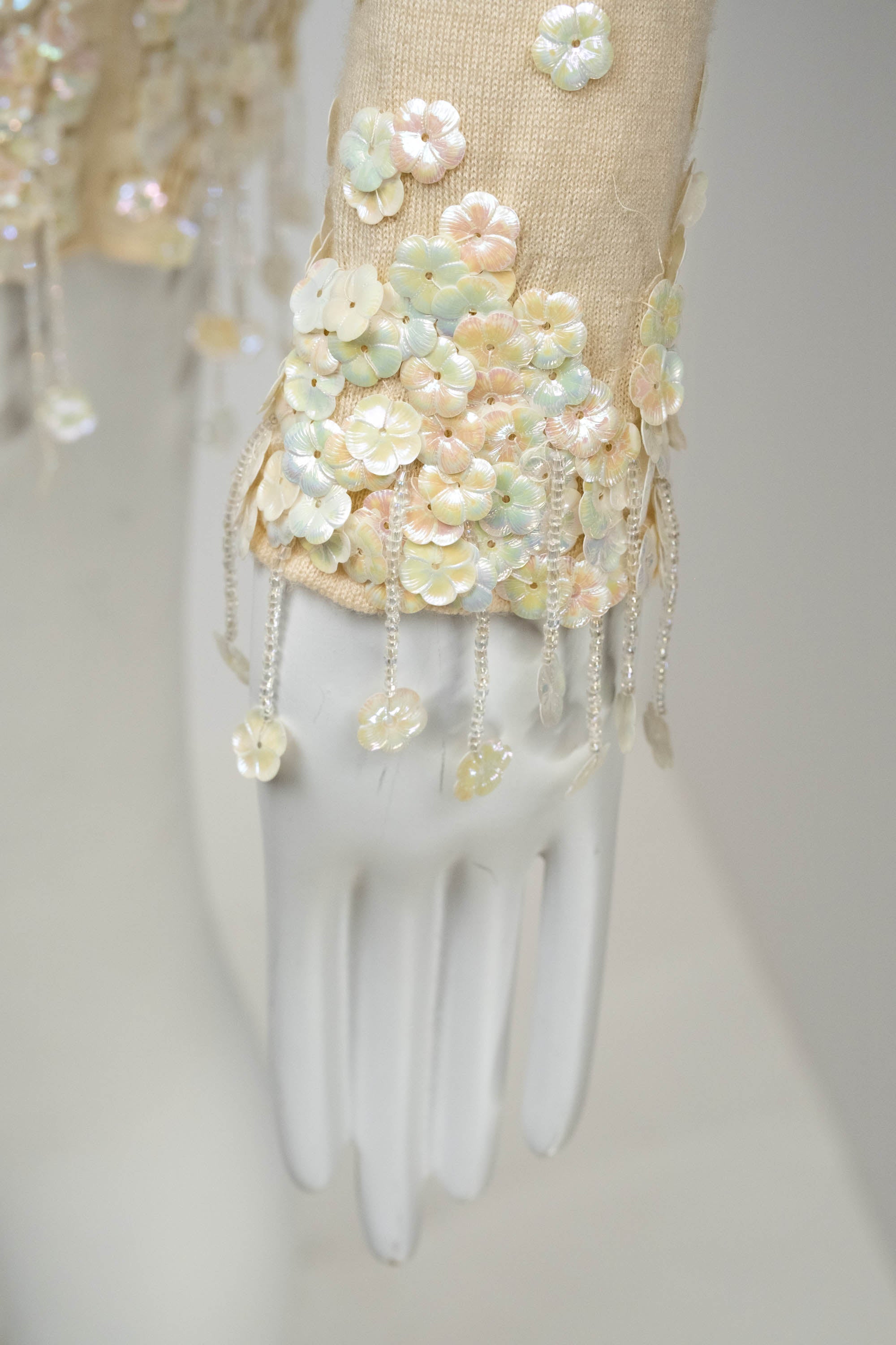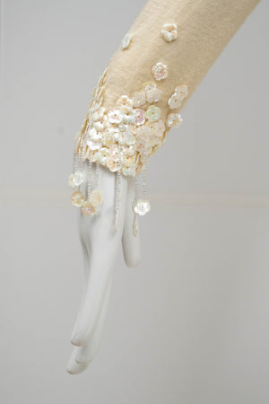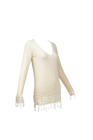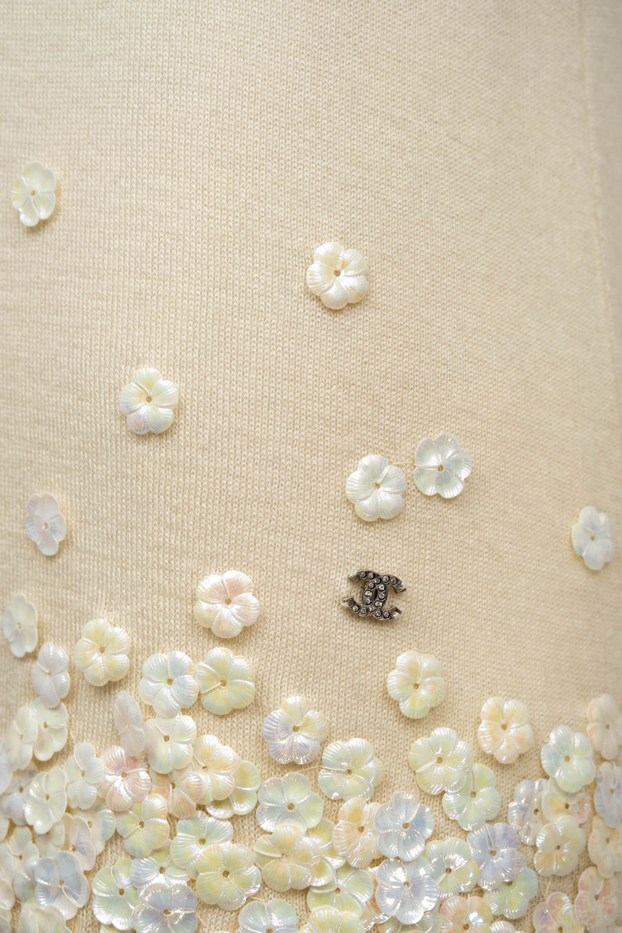 Chanel Ivory Sweater With white Flower Sequins Size S/M. Soft ivory knit with delicate floral sequins. Subtle fringe and textural detailing at hem and cuffs. Elegant, feminine take on a classic sweater.