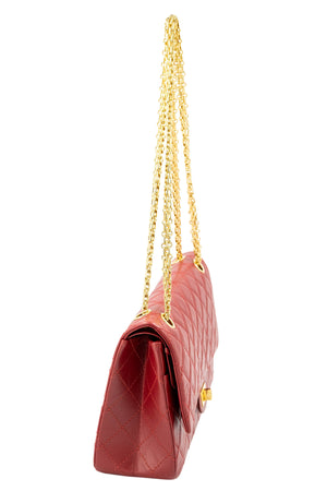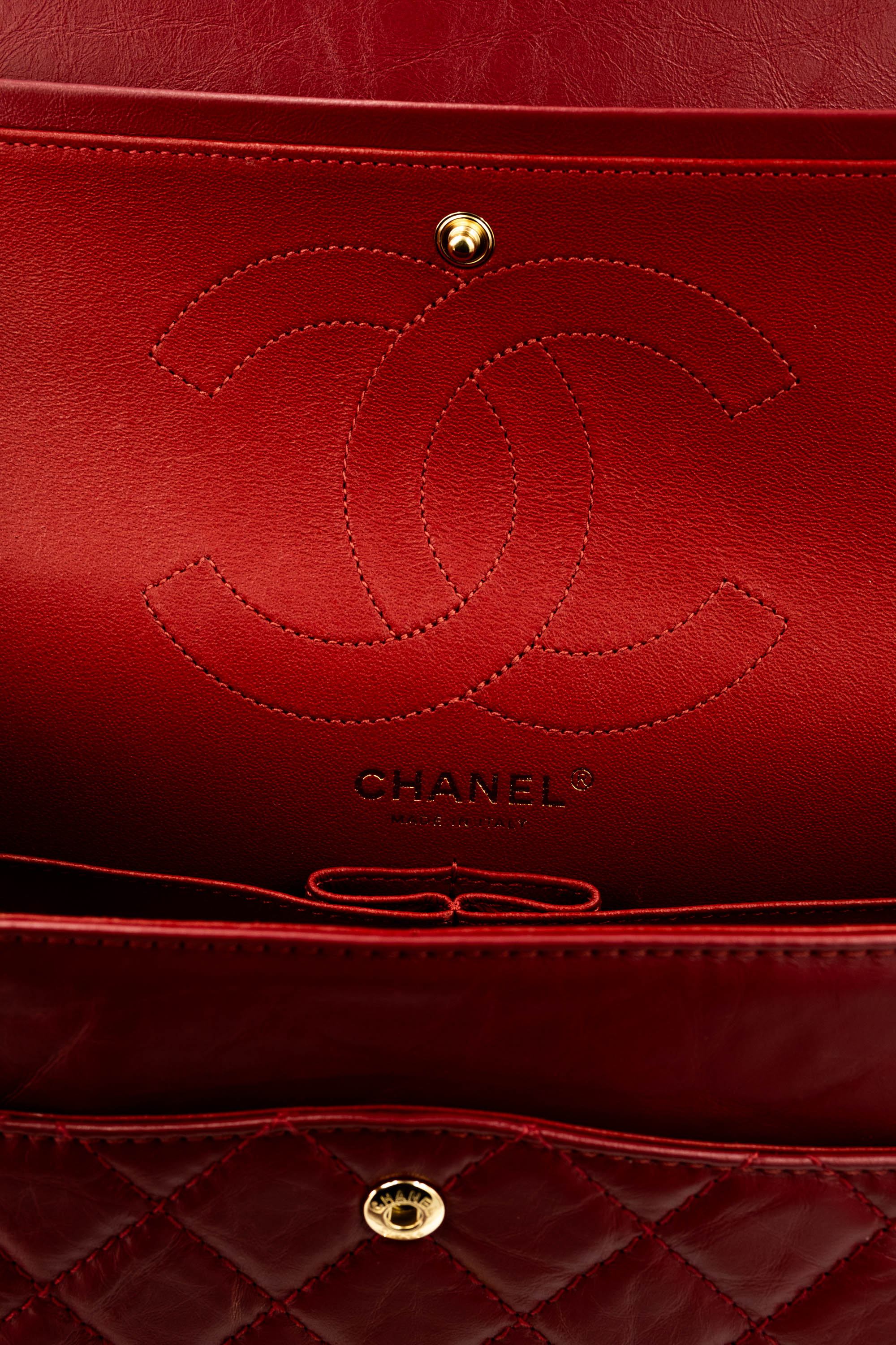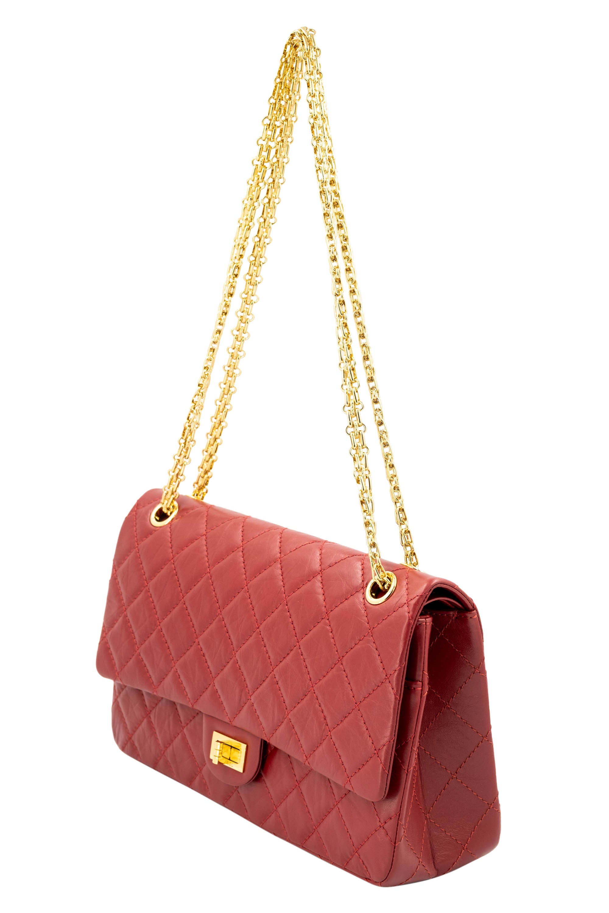 Chanel Red Quilted Leather Double Flap Purse Size Jumbo. Purse is featured in red quilted leather with gold tone hardware. Gold turn lock closure on face of bag. Chain is bijoux style. Red leather interior.