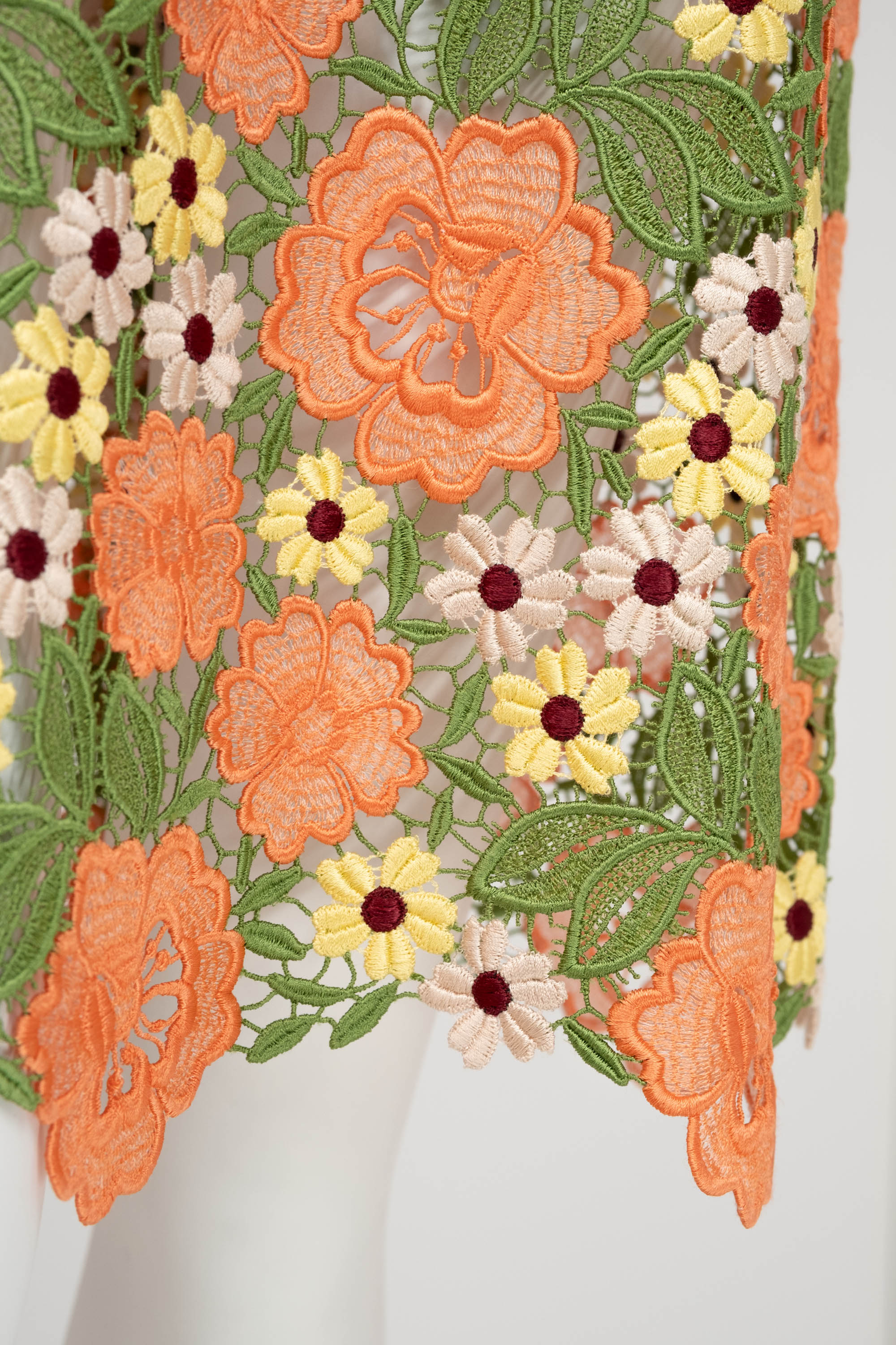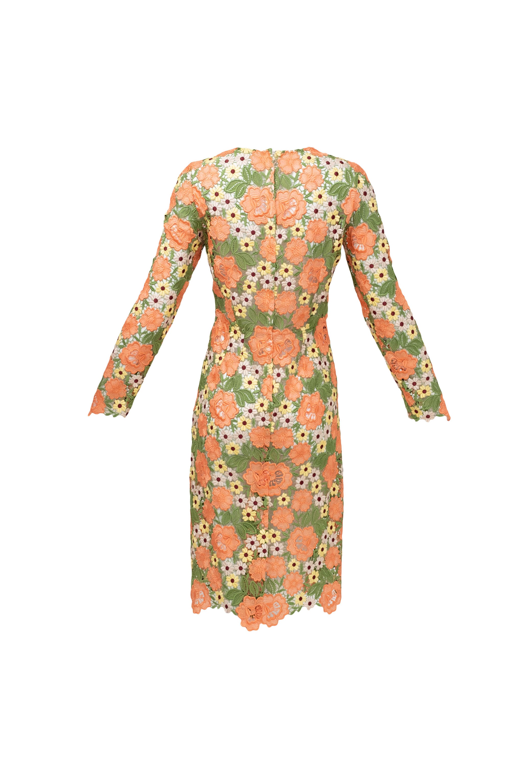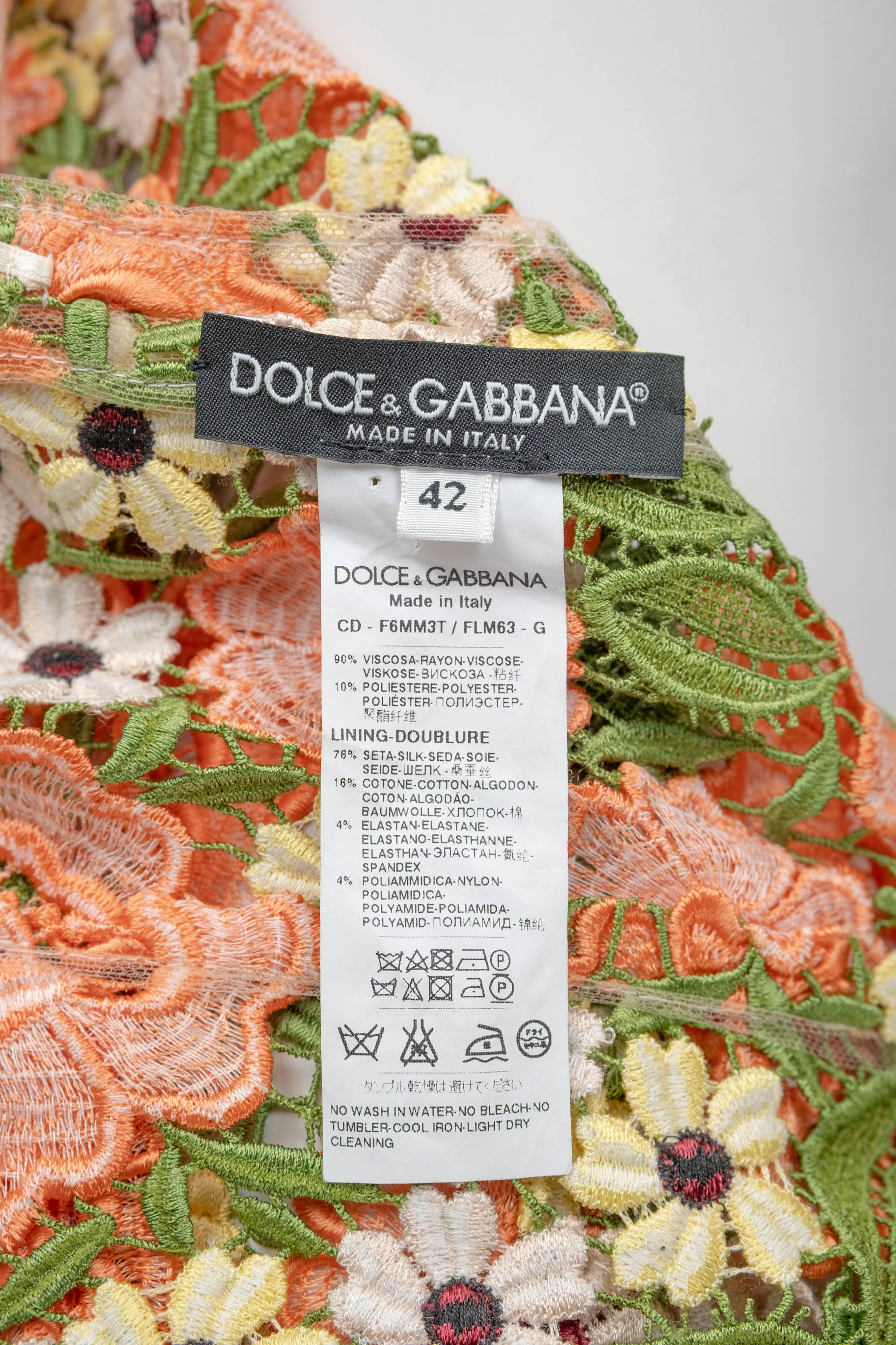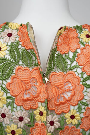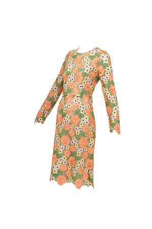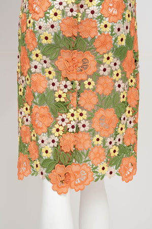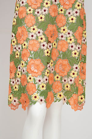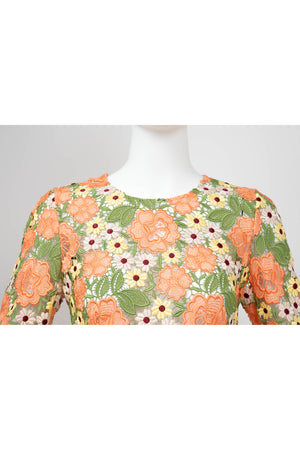 Dolce & Gabbana Multicolor Floral Guipere Lace Long Sleeve Dress Size 42/6. Floral lace in green, pastels, and coral. Lace trim on sleeve and skirt. Zipper closure on back of dress.