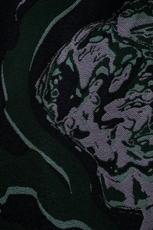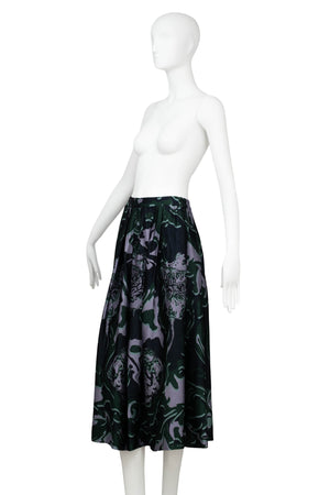 Dries Van Noten Green Floral Soni Abstract Jacquard A Line Skirt Size 34. Midi length skirt with gathering at the waist. Unique dark green and lavender swirling pattern all over. Features side slit pockets and zipper side closure with hook fastening.