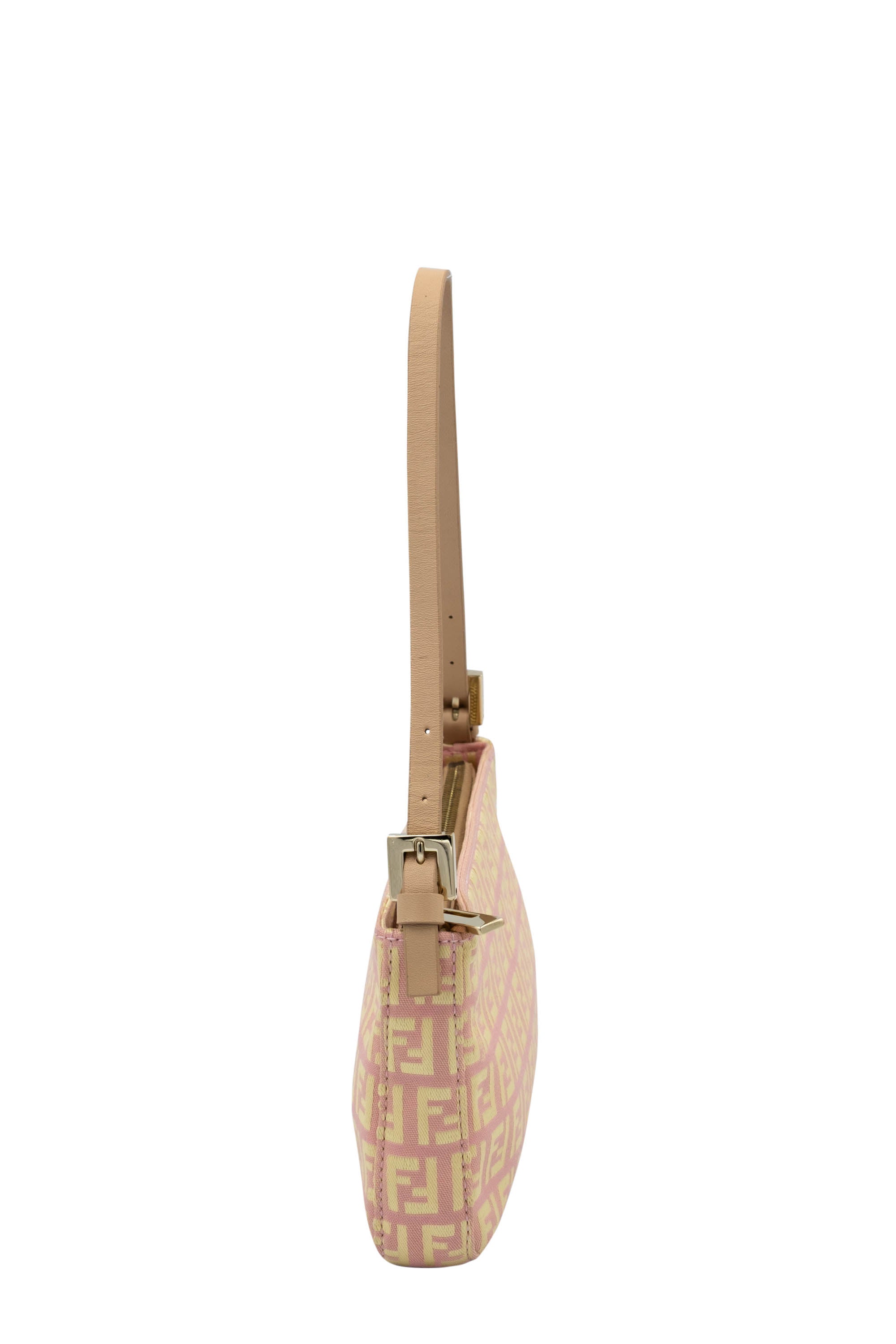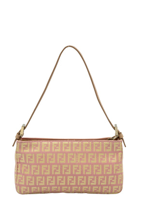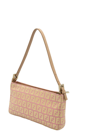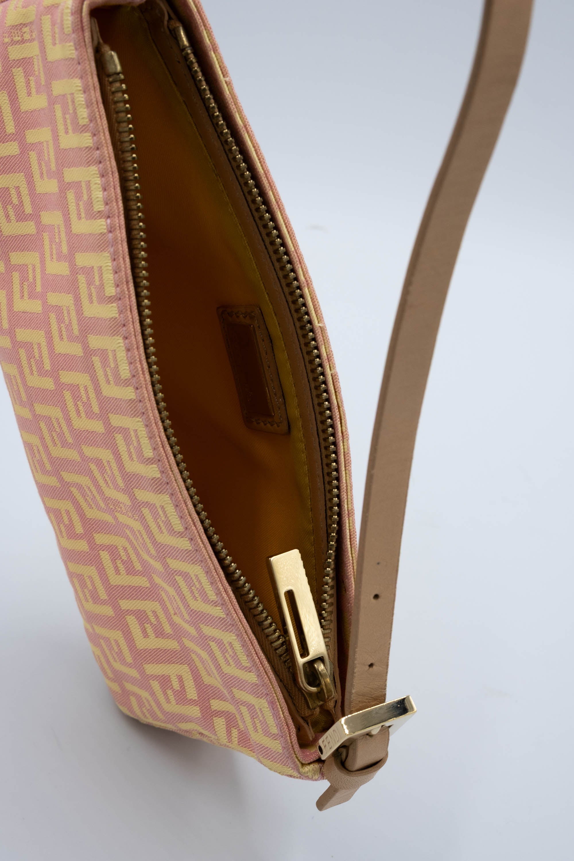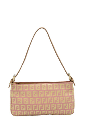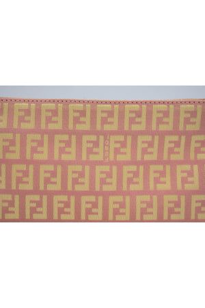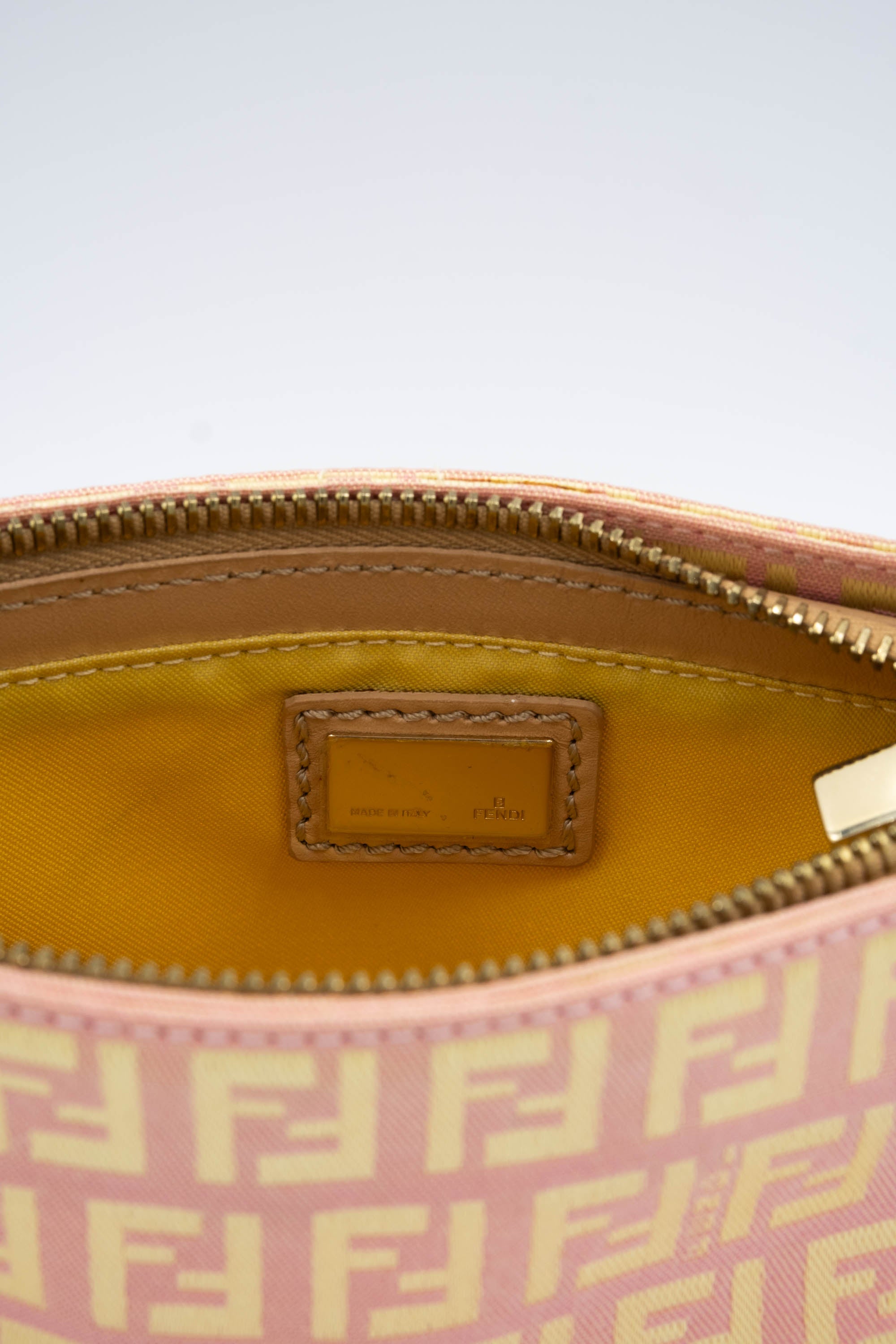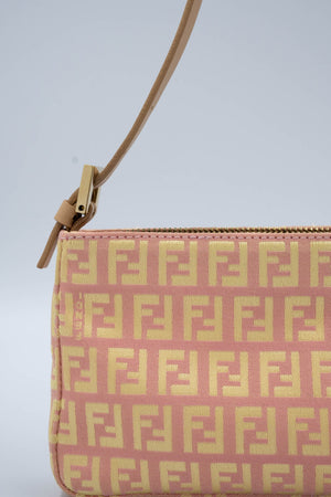 Fendi Mini Pochette Pink and Yellow Zucca Patten. Classic Zucca pattern in yellow and pink. Leather adjustable shoulder strap with gold tone hardware. Zipper closure on top of bag. Yellow colored lining.