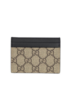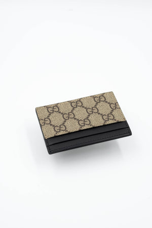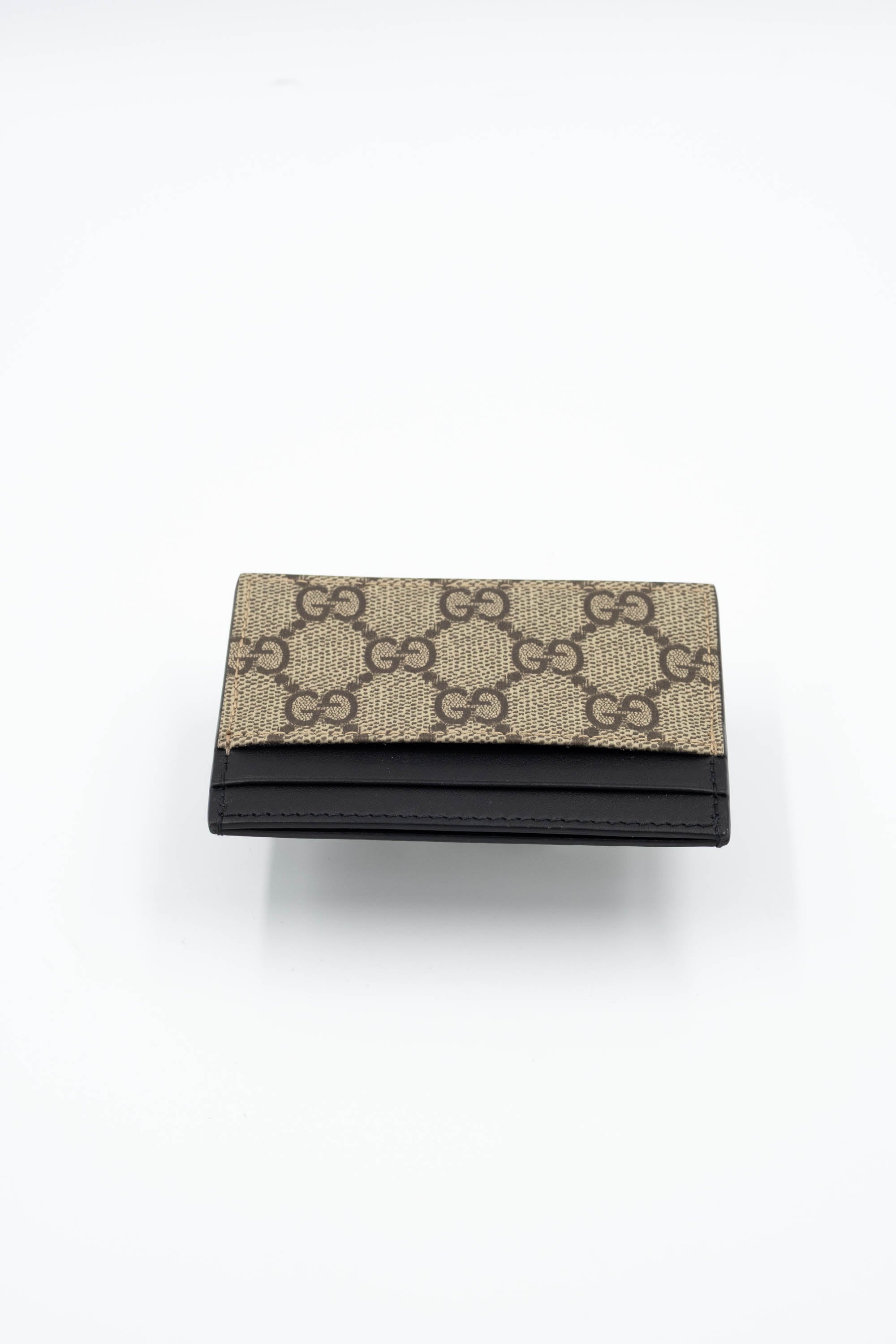 Gucci Black and Brown Monogram Pattern Card Holder. Classic GG coated canvas with black leather trim. Slim profile with miltiple card slots. Polished, everyday essential card holder with iconic branding.