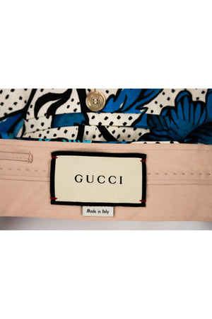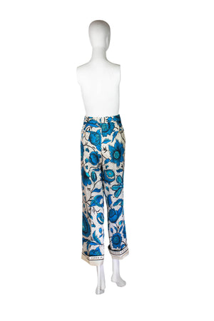 Gucci Blue and White Floral Print Silk Pants Size Small. Beige and BLue floral print with pleat down the front of pants. Cuffed pant with gucci text. Zipper and button closure.