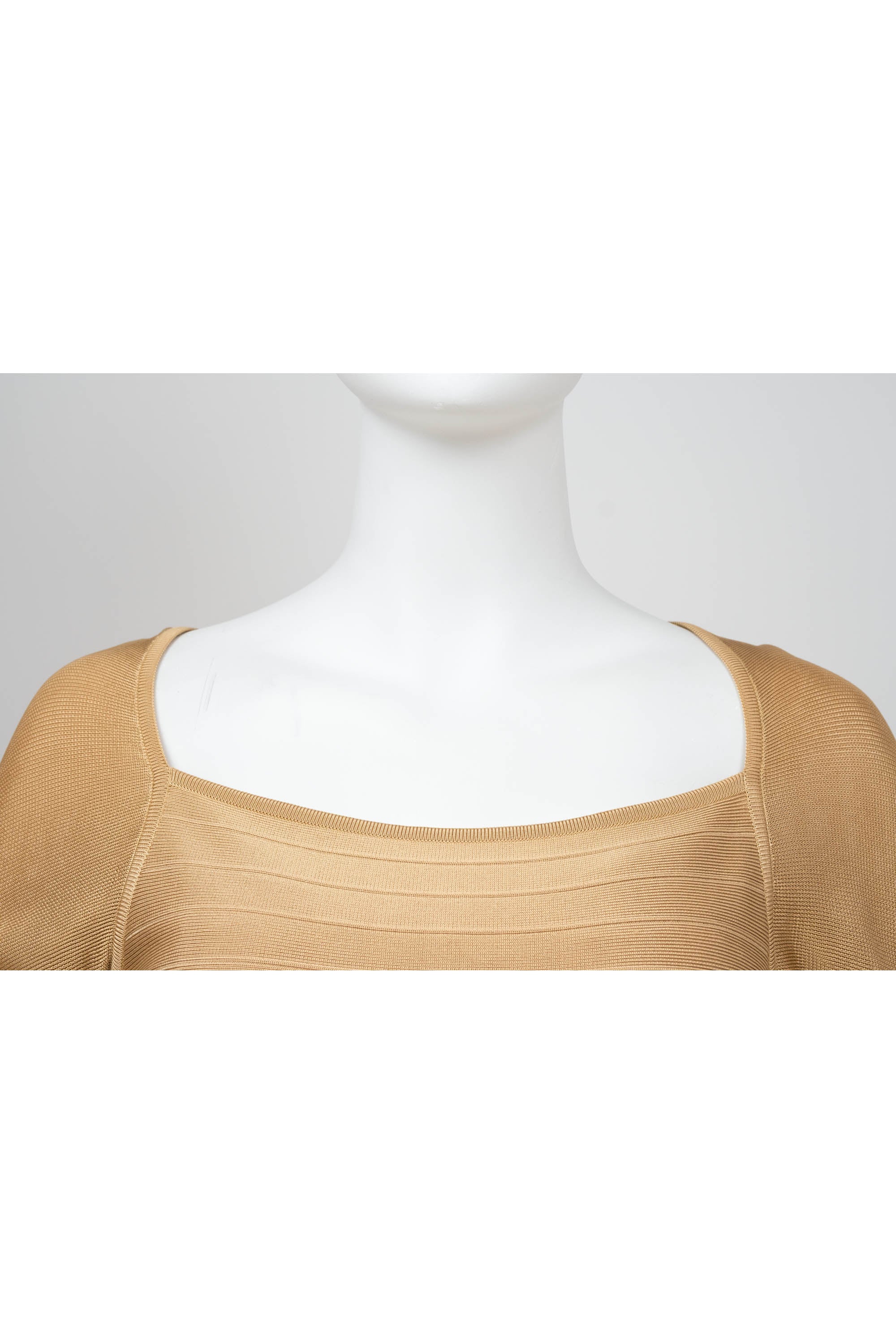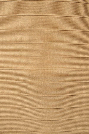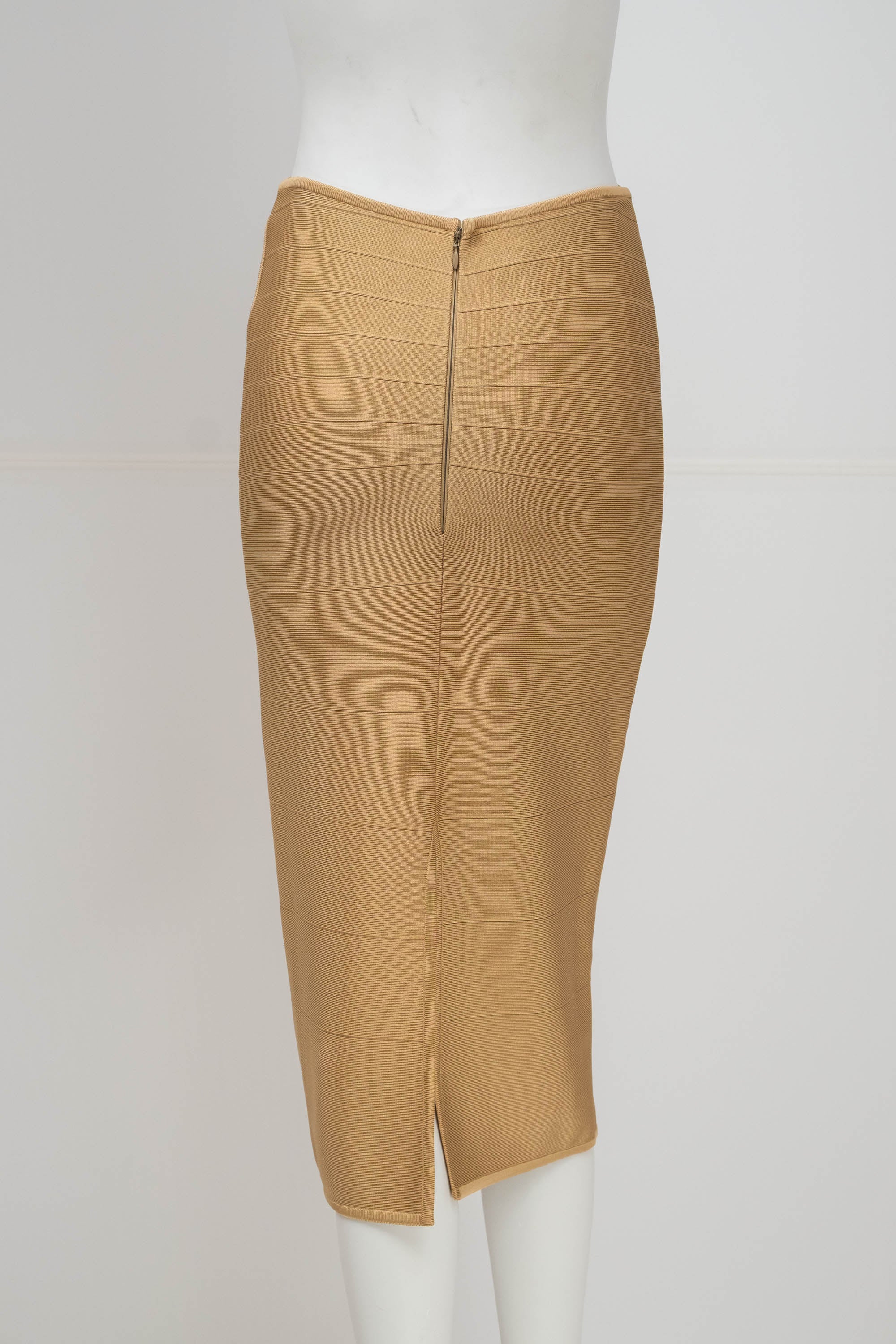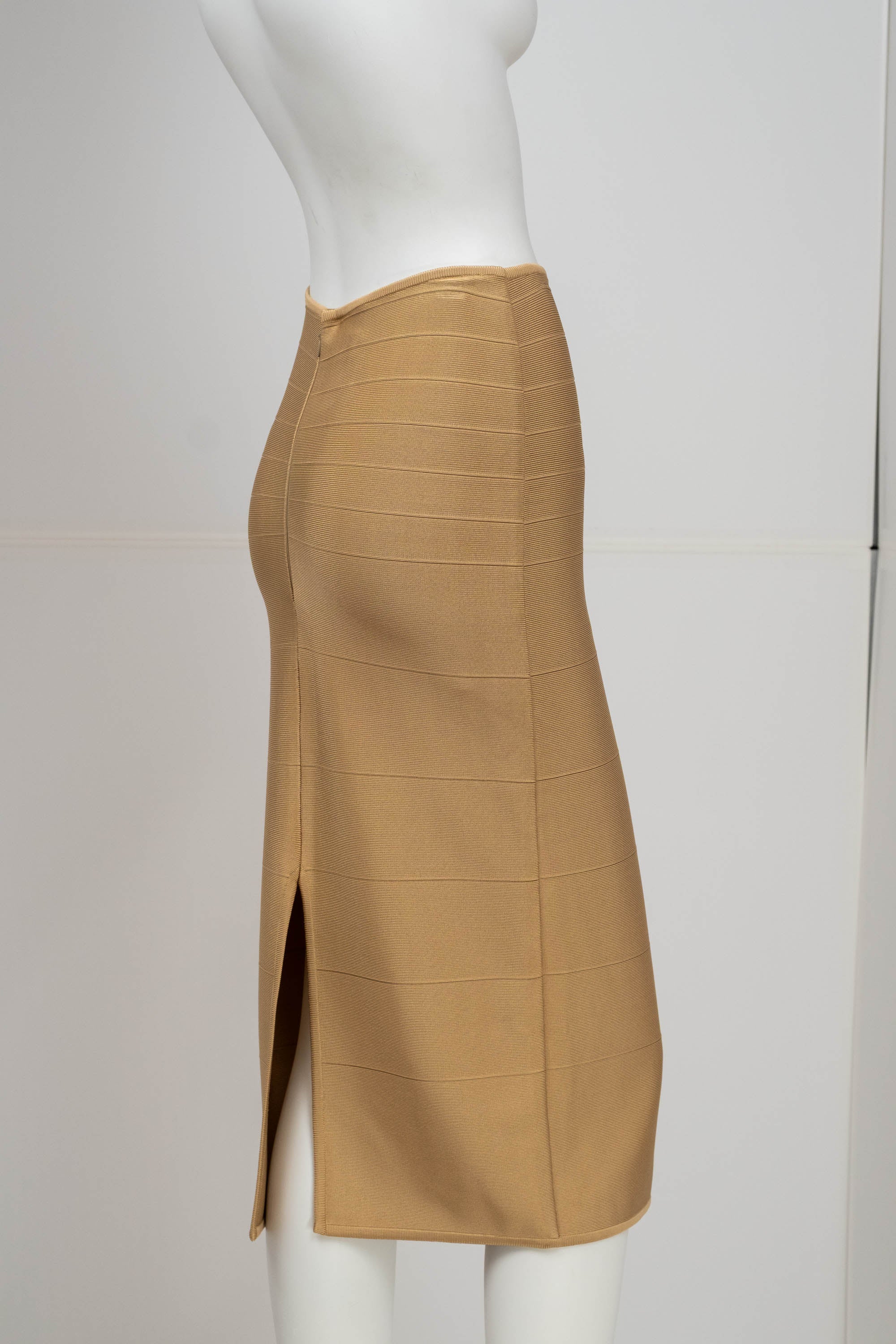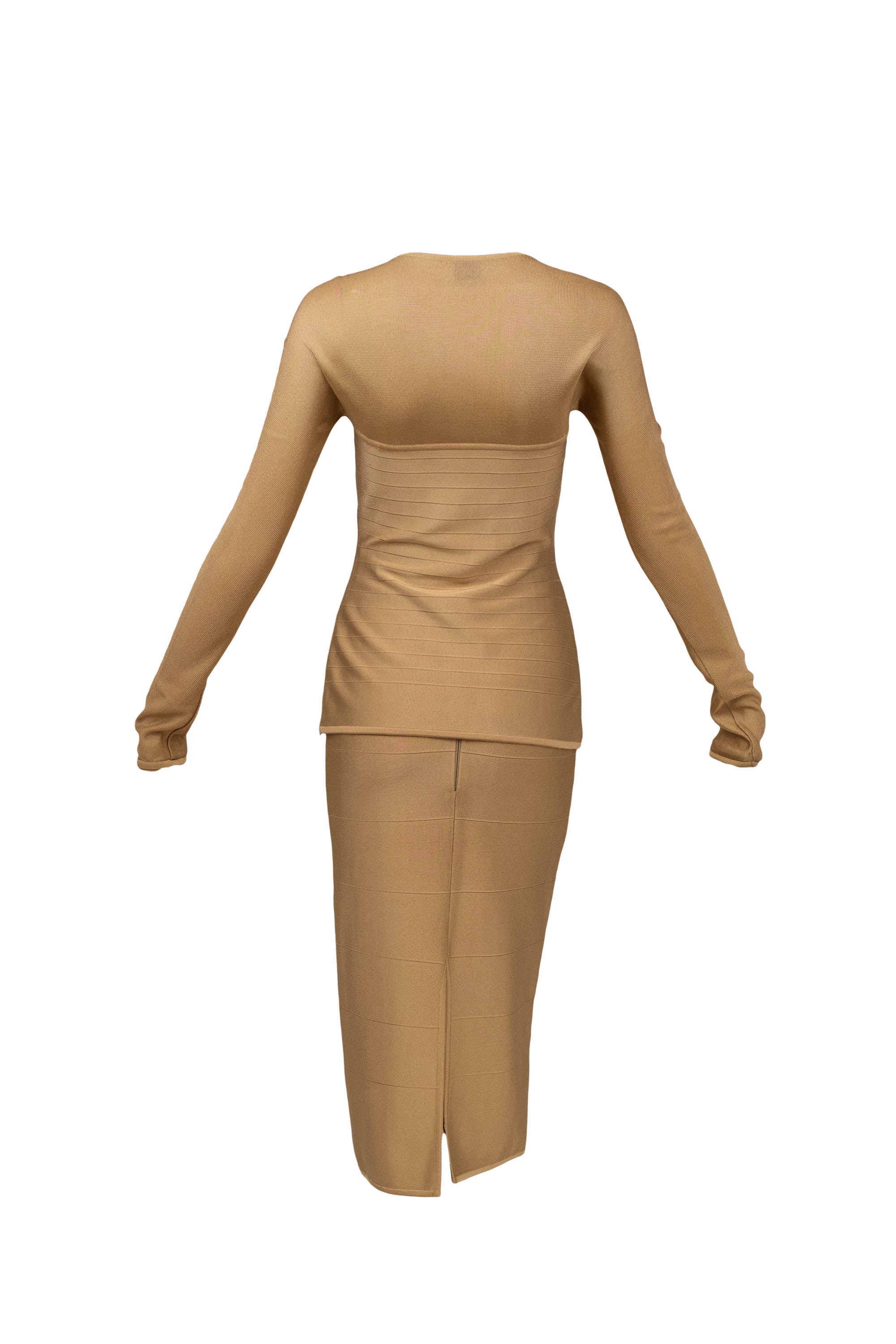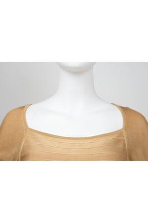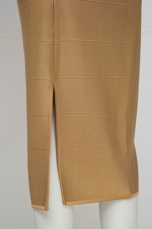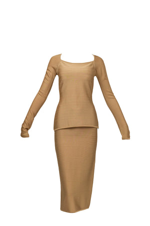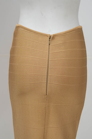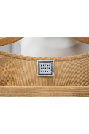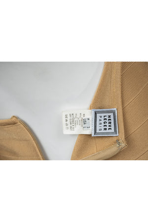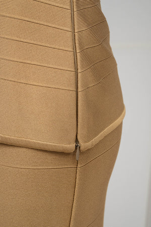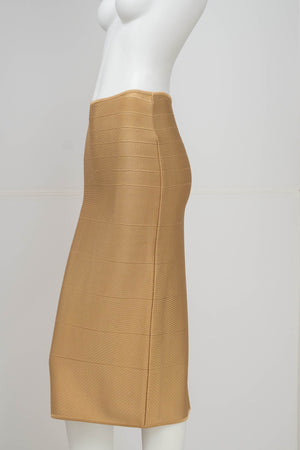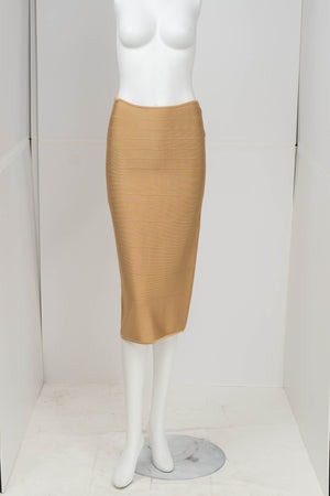 Herve Leger Paris Gold Skirt Set Size Large. Signature bandage knit construction. Sculpting fit with gold finish. Statement set with body contouring structure.