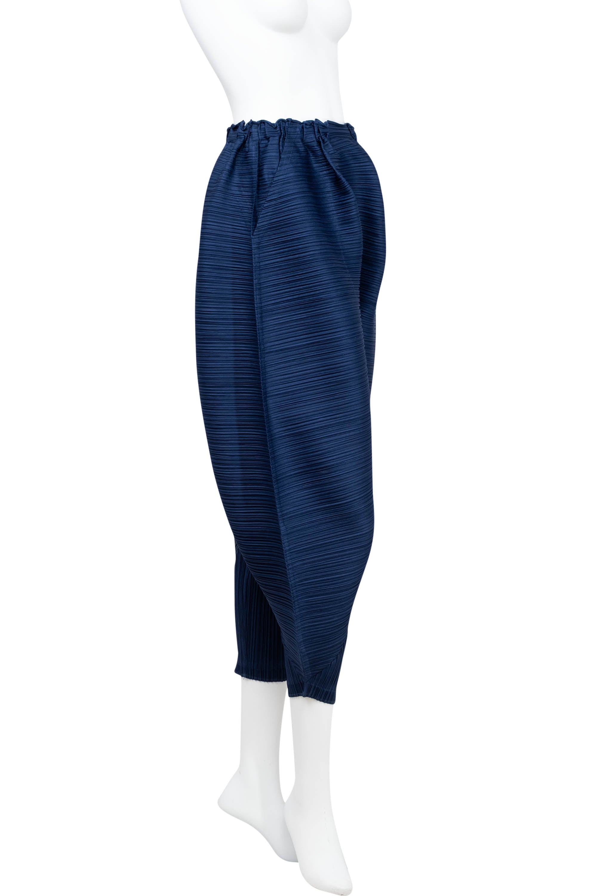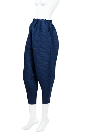 Issey Miyake Blue Pleats Please Cropped Drop Crotch Pants Size 3. Extreme drop crotch pants with elastic waist. Vertical pleats with intersecting directional shift at opening of pant.
