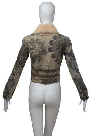 Jean Paul Gaultier Denim Grey Floral Print Jacket With Fur Neck Size M