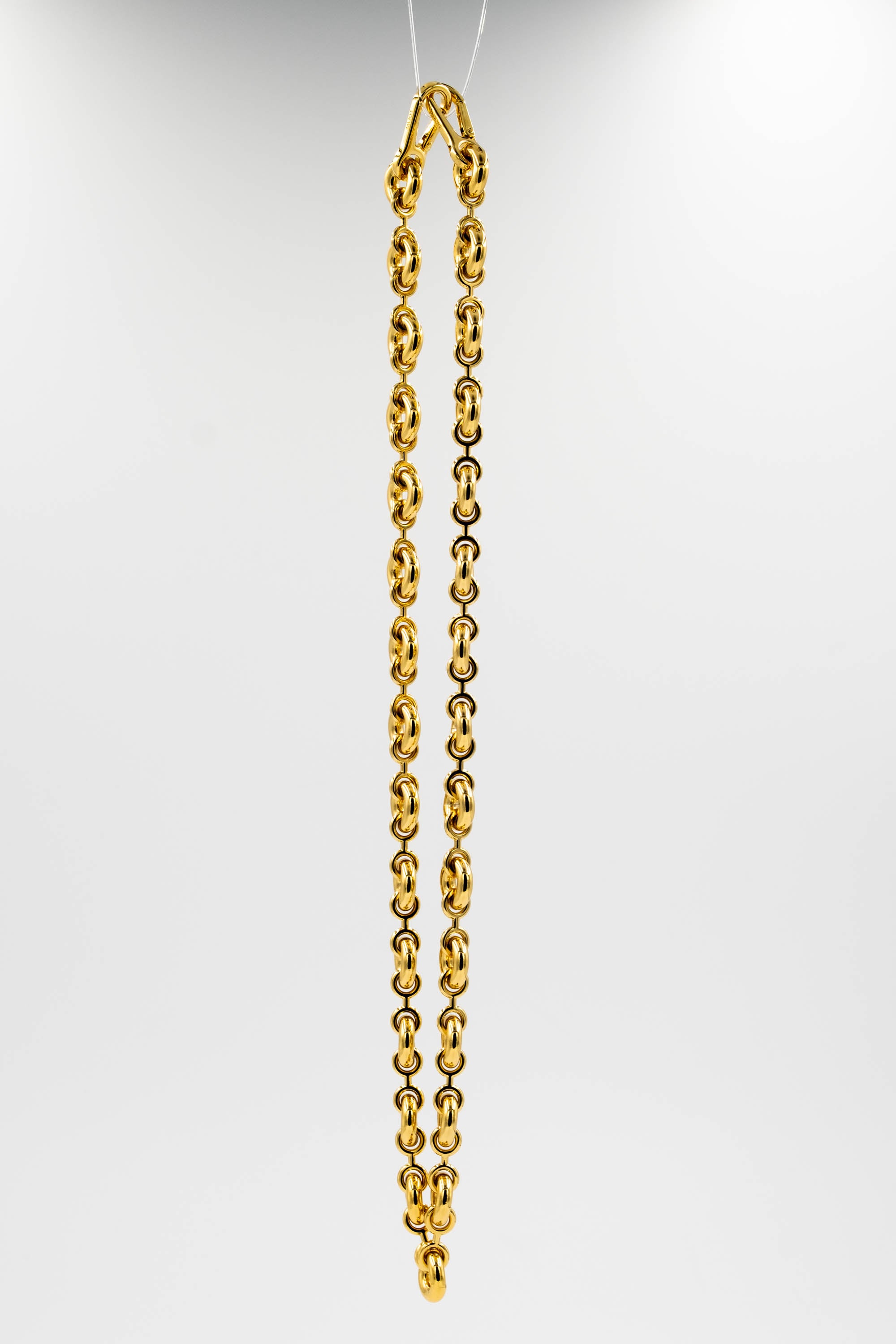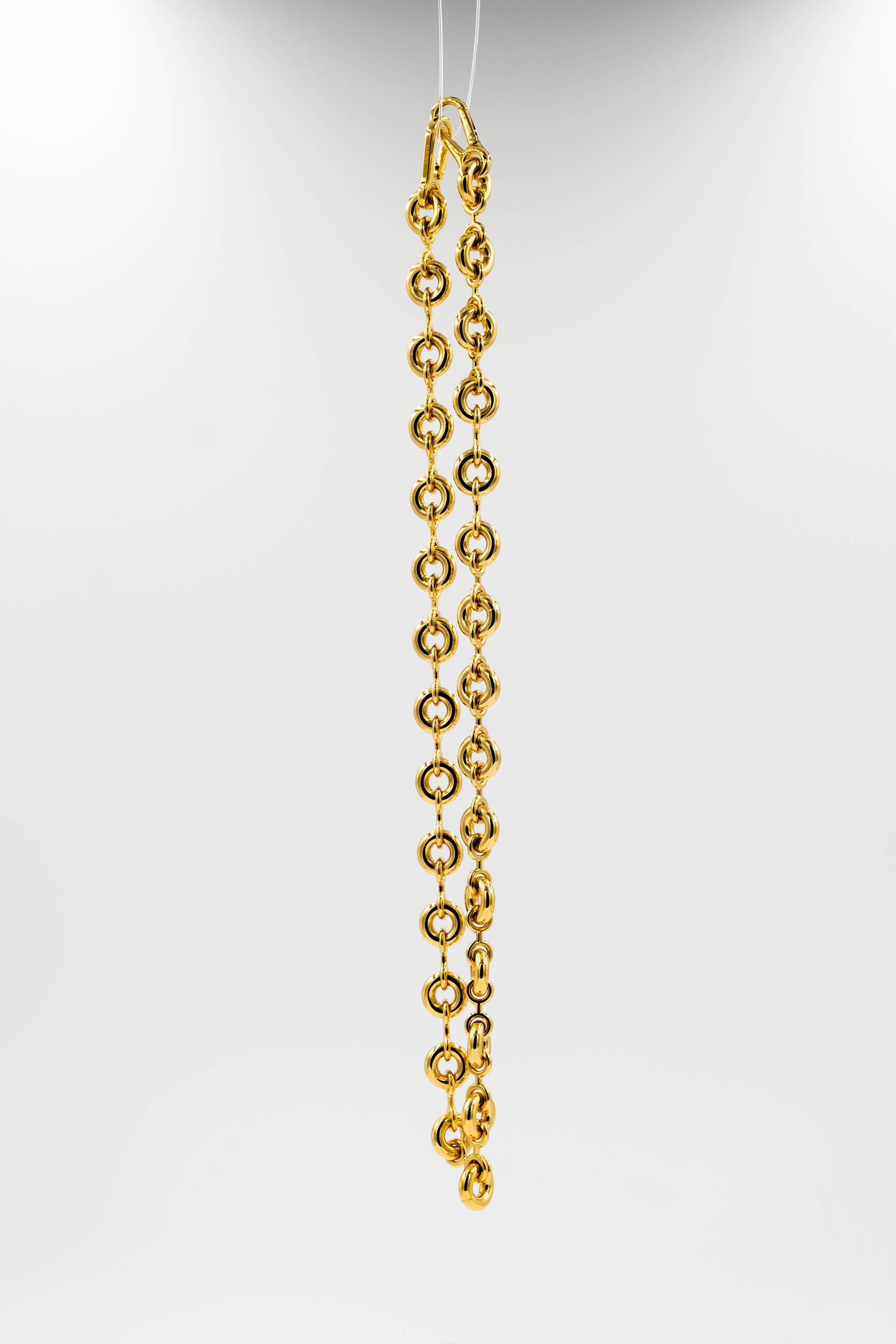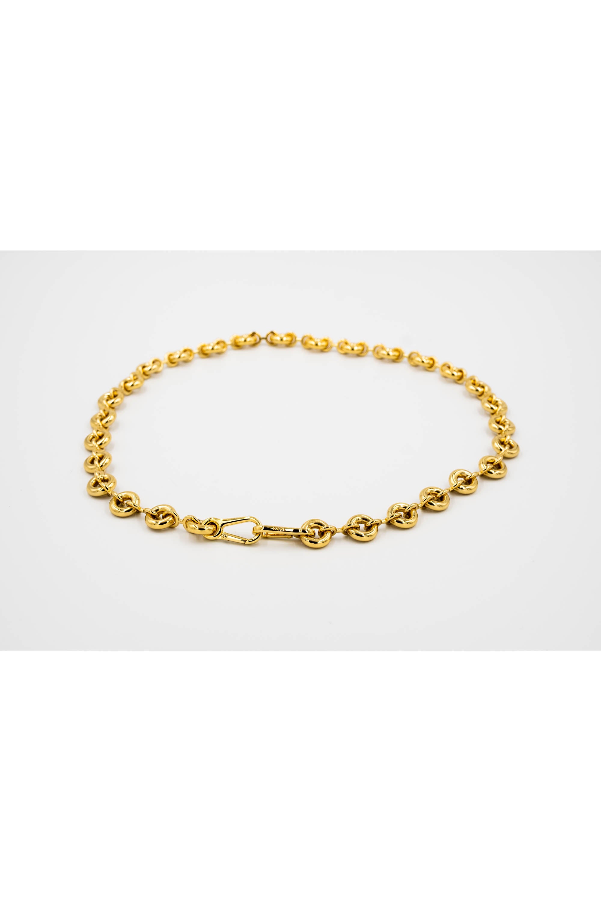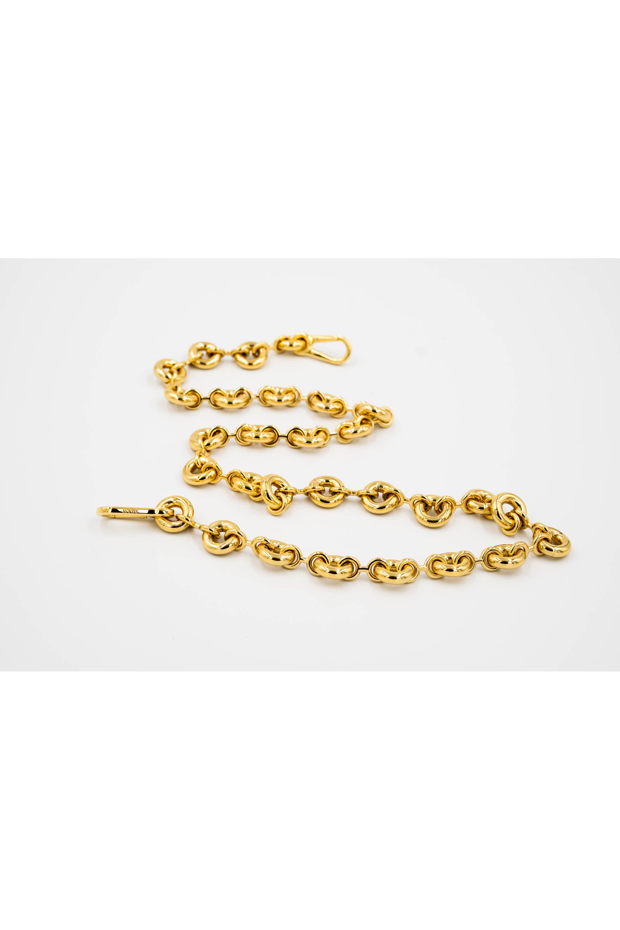 Loewe Gold Tone Donut Chain Link Necklace. Sculptural gold-tone chain necklace with rounded donut-style links. High polish finish. Adjustable length with lobster clasp closure. Statement piece that sits beautifully at around the collarbone. Timelessly distinctly modern Loewe design.
