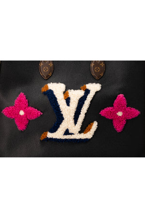 Louis Vuitton Teddy on the go Black Leather and Shearling Tote Size GM. Black leather exterior with shearling trim and detail. Front features LV monogram in fuchsia. Top handles in classic monogram canvas and leather shoulder handles. Red Alcantara lining. Complete with box and dustbag.