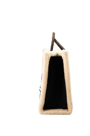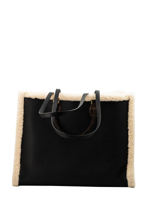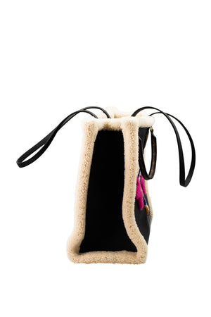Black leather with shearling accents and coated canvas handles. Alcantara interior lining.