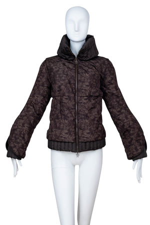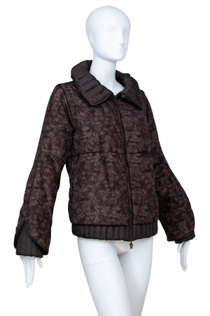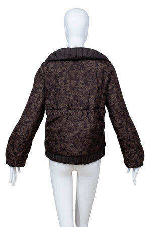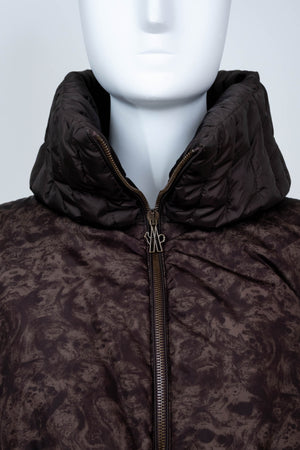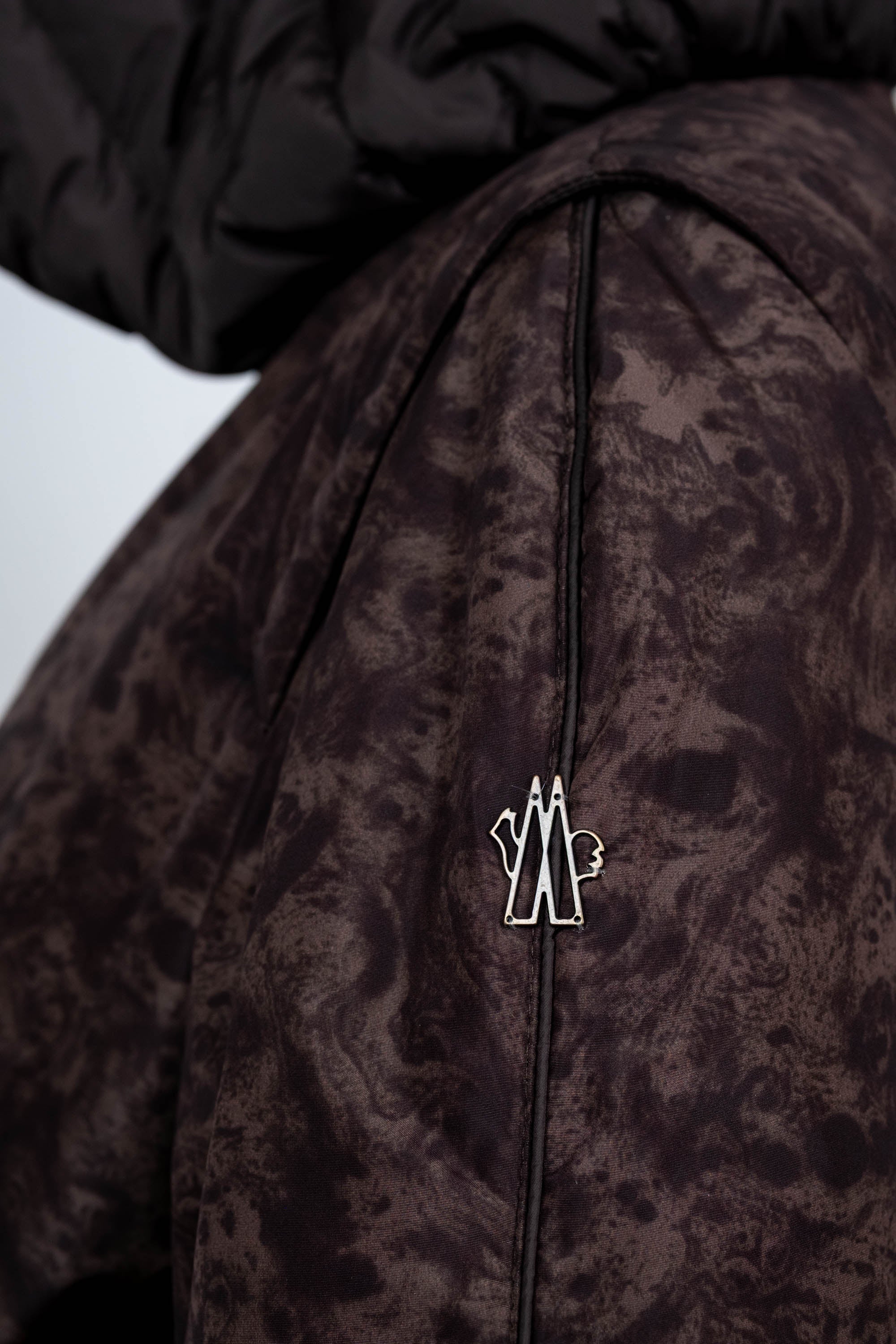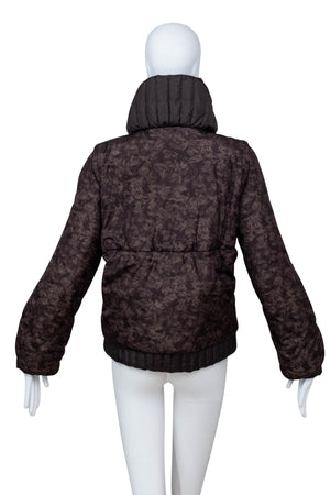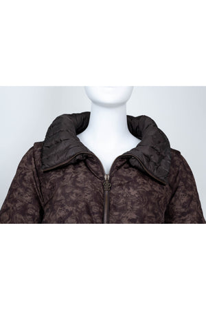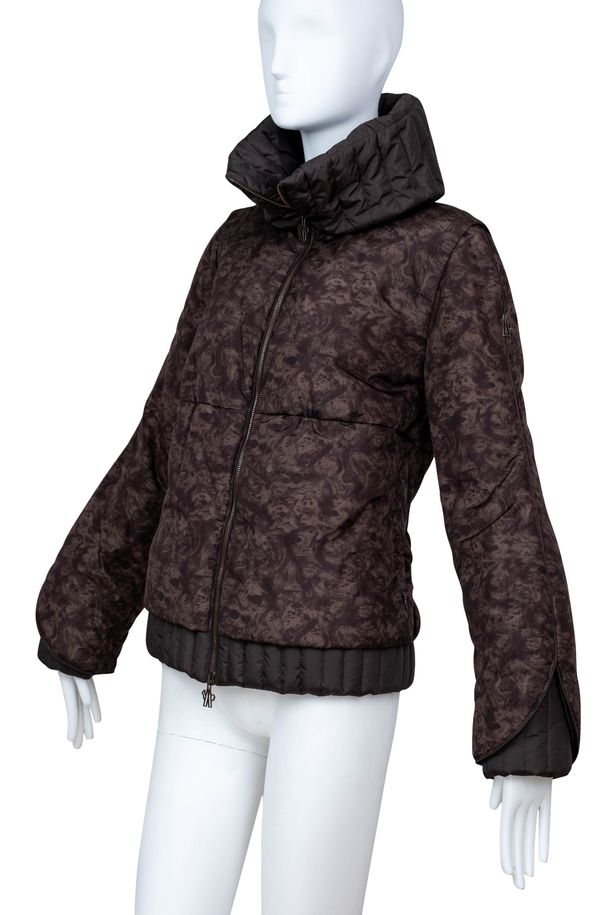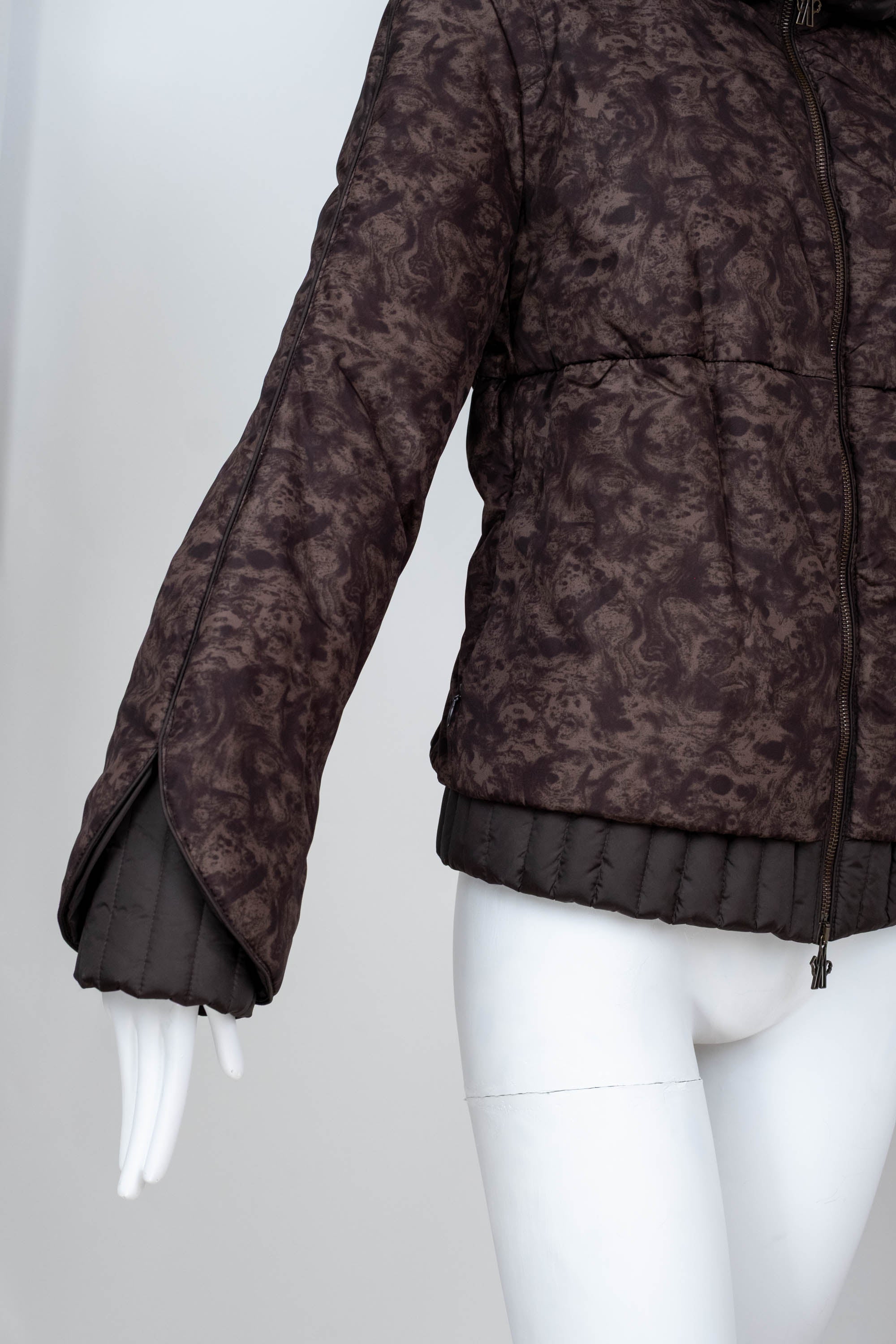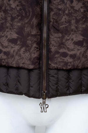 Moncler Size 2 Small/Medium Brown Black Puffer Jacket. Brown marbled style print. Features a large collar that can zip up or fold down over the shoulder. Zipper closure with monogram hardware.