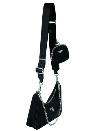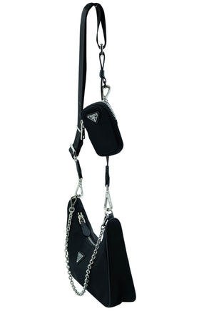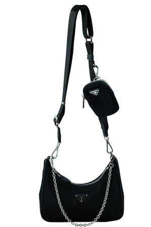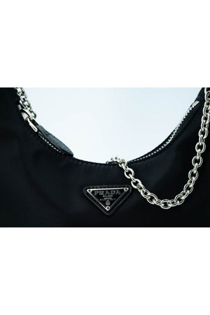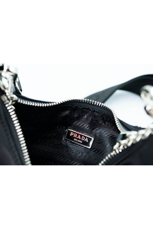Prada Re-Edition Black Nylon Shoulder Bag With Pouch. Exterior of bag is black nylon. Silver tone hardware and chain accessory across the from of the bag. Adjustable shoulder strap with Prada branding. Zipper closure across the top of bag. Includes a small pouch for storage.