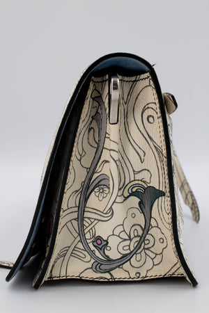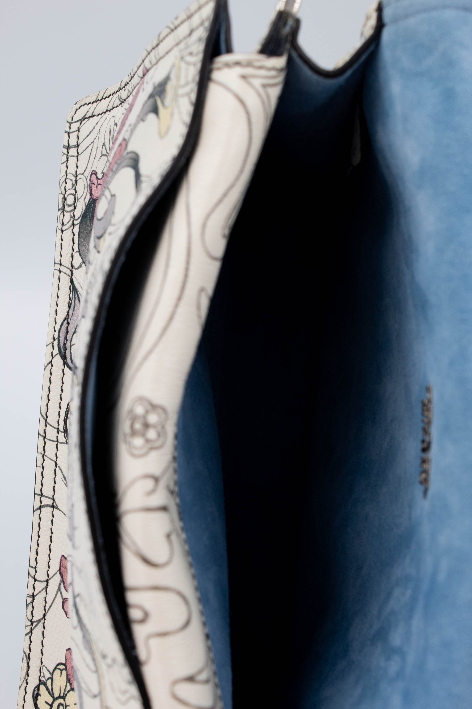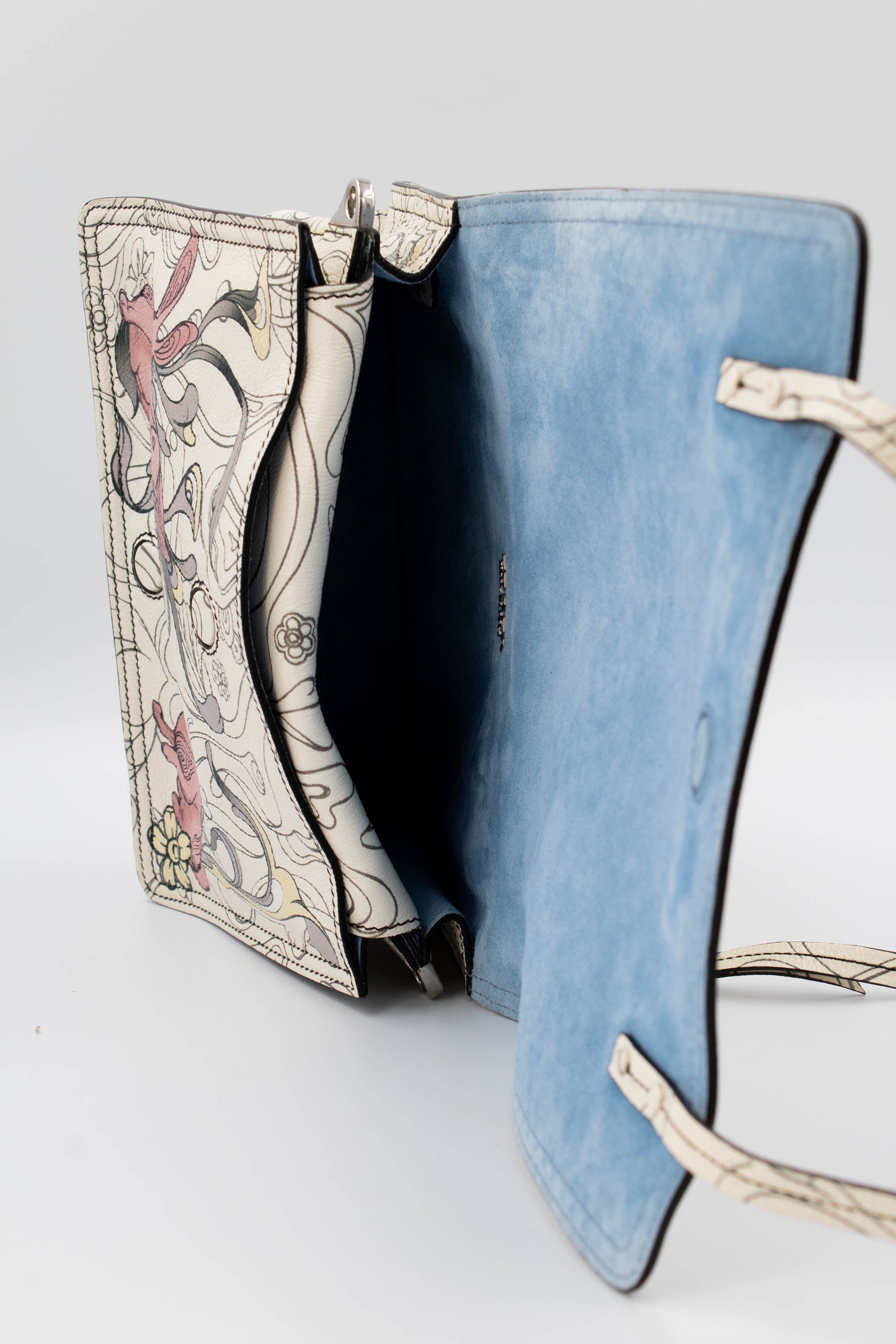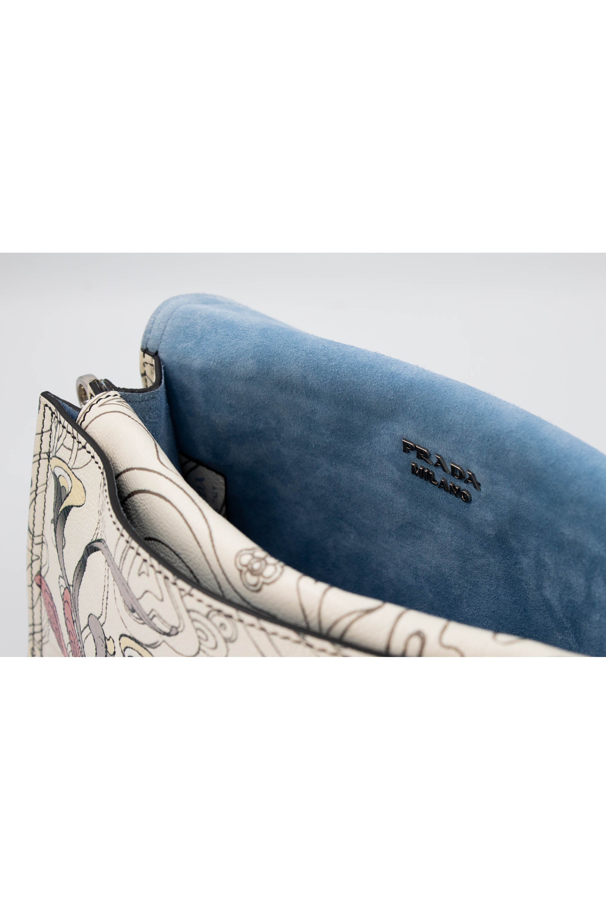 Prada x James Jean Etiquette Bunny Print Cream Purse 2018 Size M. Cream leather with printed pattern featuring artwork by James Jean. Floral and bunny print. Prada plaque on face of bag. Magnetic closure on flap. Adjustable shoulder strap. Light blue suede interior with multiple pockets inside. Zipper pocket on back of bag. Mirror tag charm. Super cute and extremely collectable series.