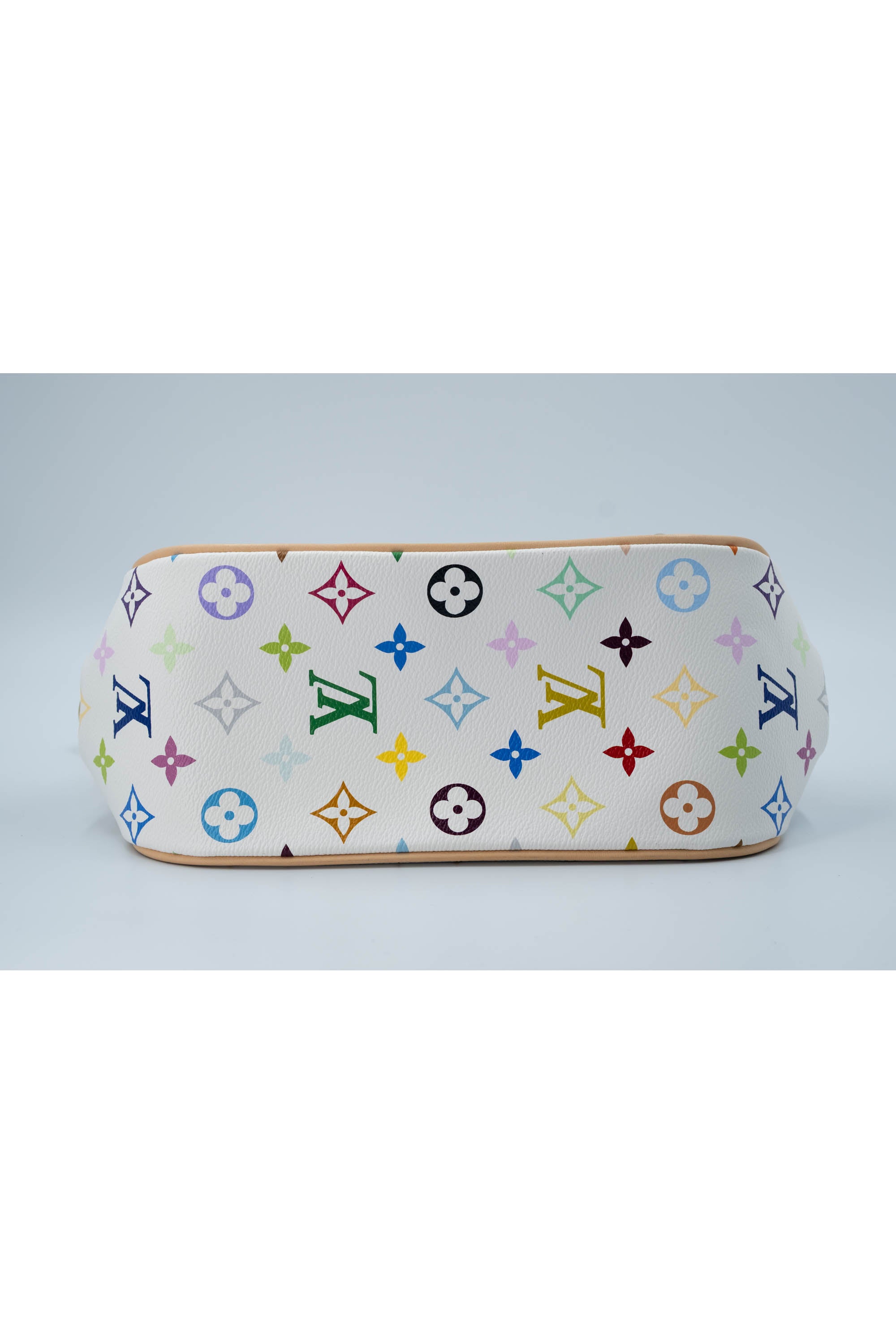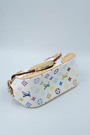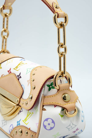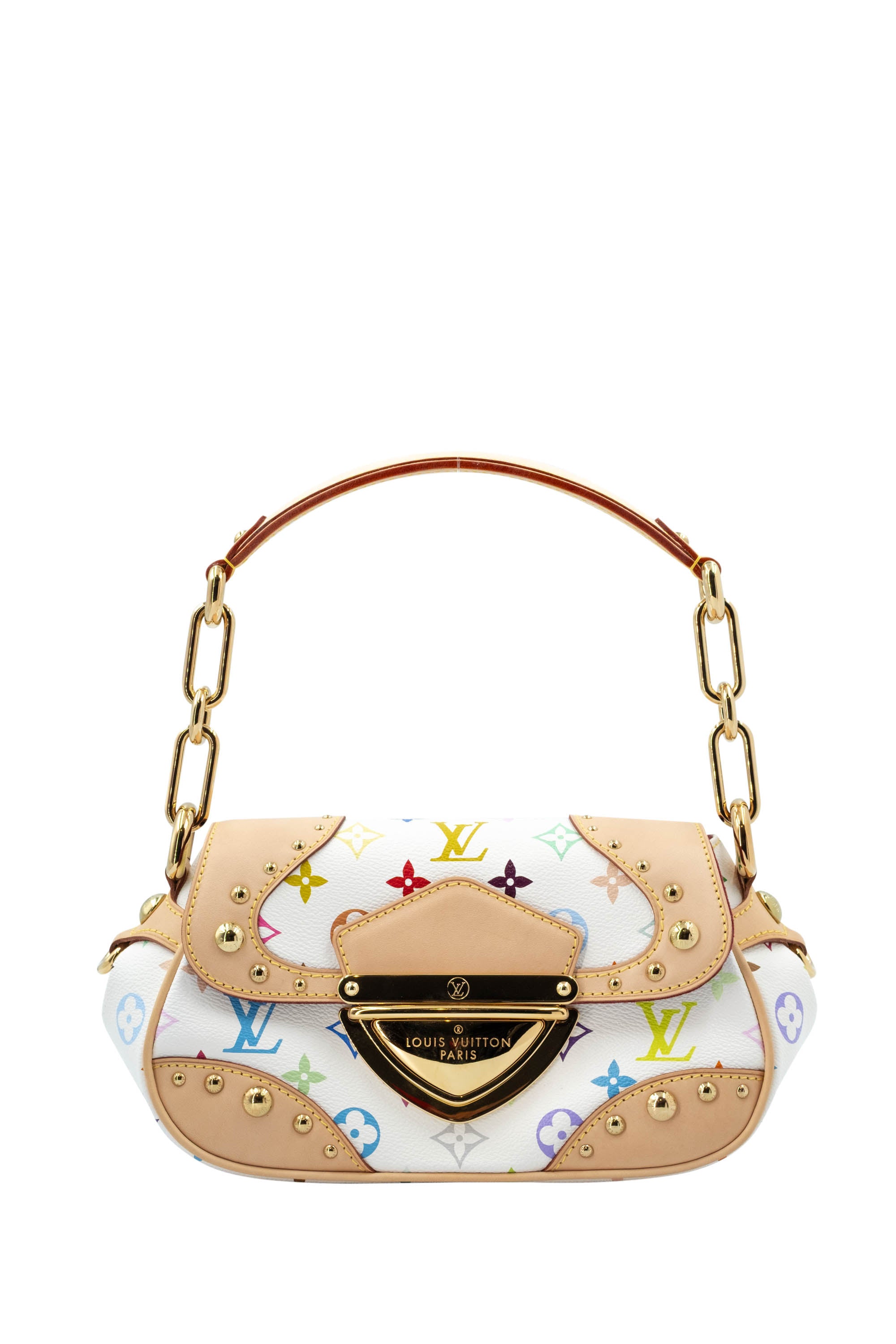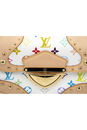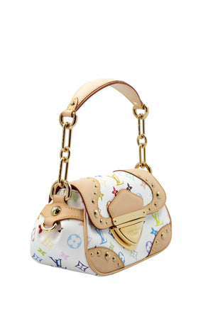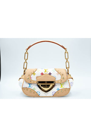 Takashi Murakami x Louis Vuitton White Monogram Multicolore Marilyn Size Small. Gold chain with leather shoulder strap. Signature white and multicolore monogram pattern. Push lock closure. Red Alcantara lining on inside and rear pocket.