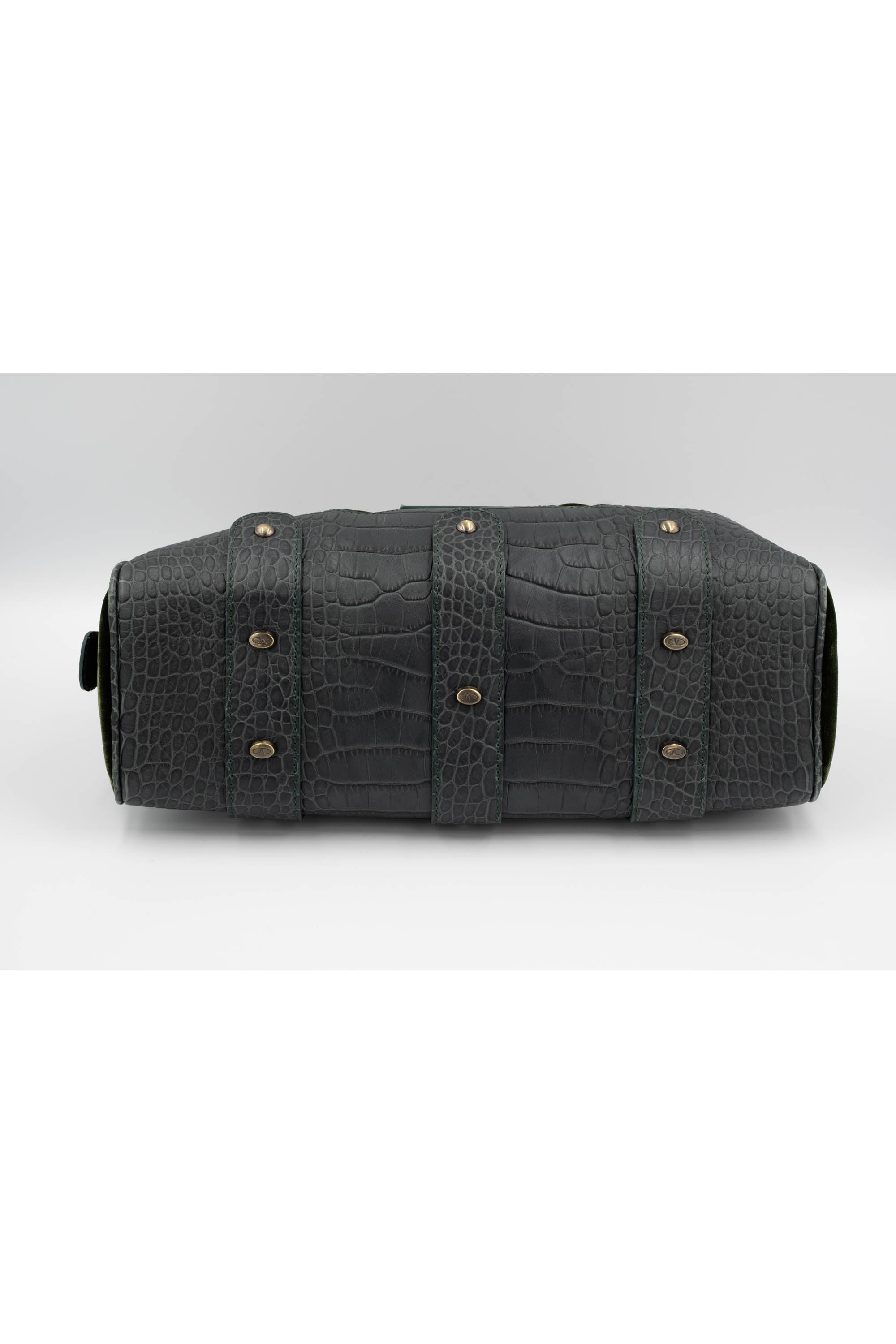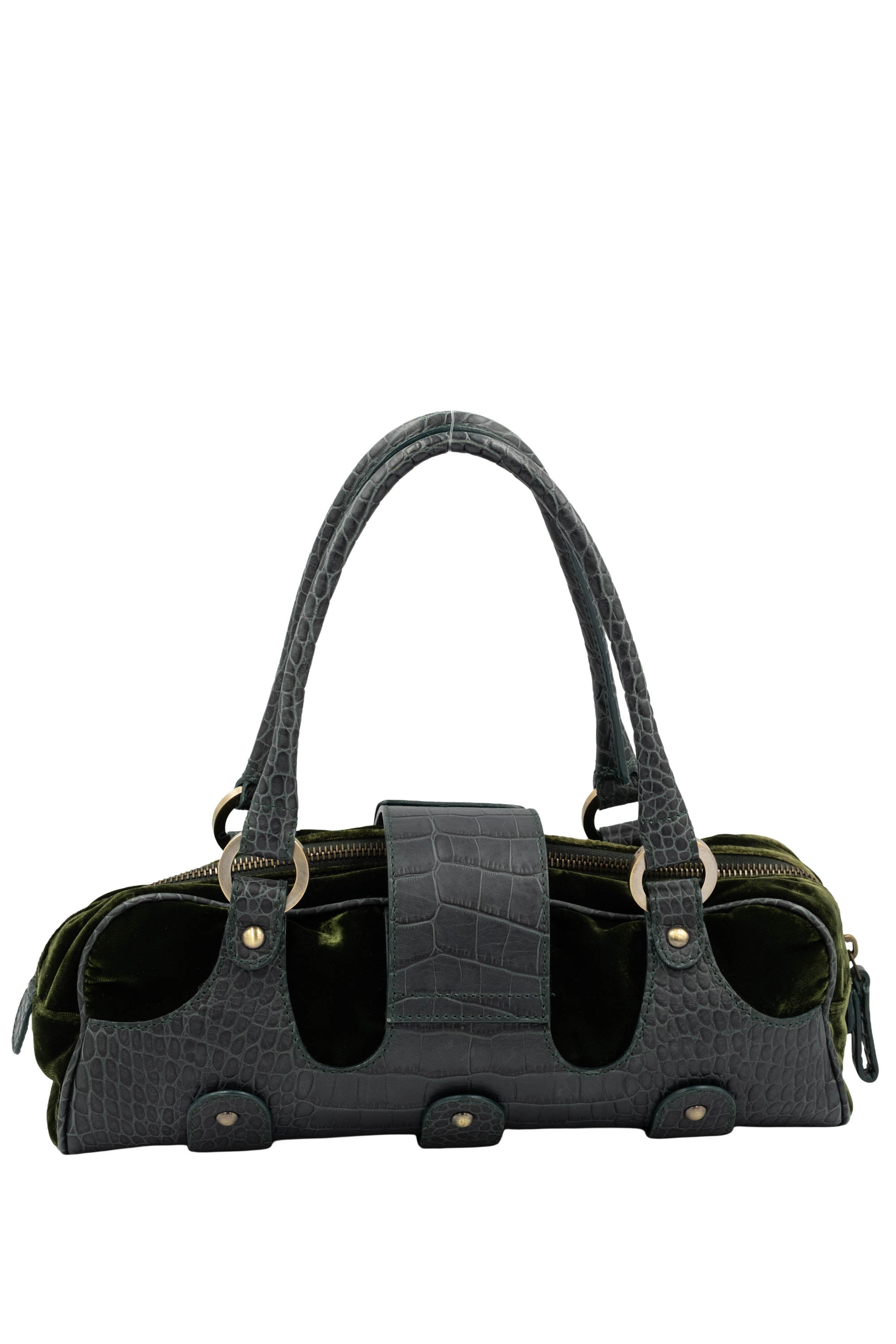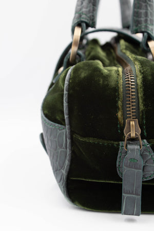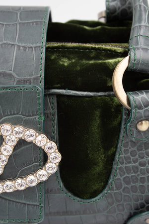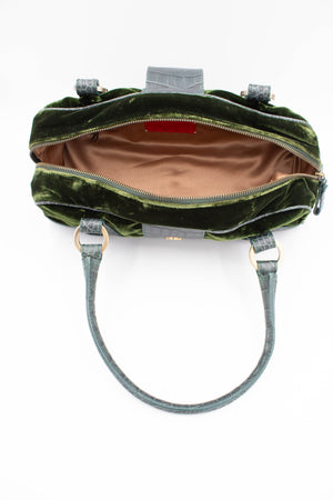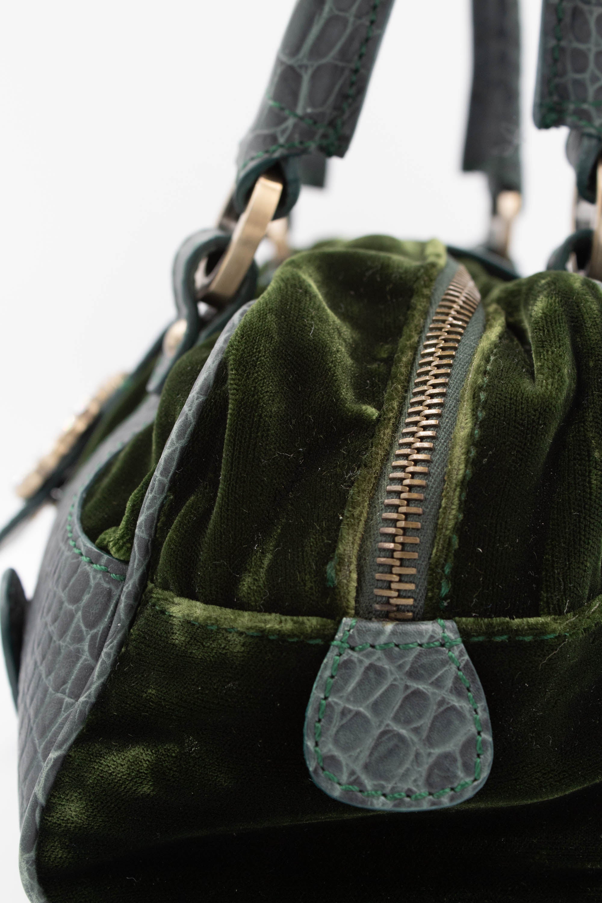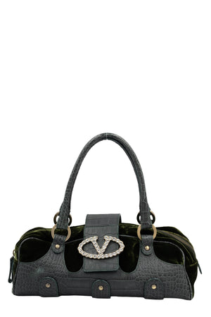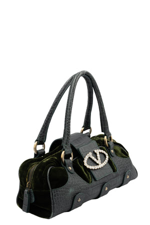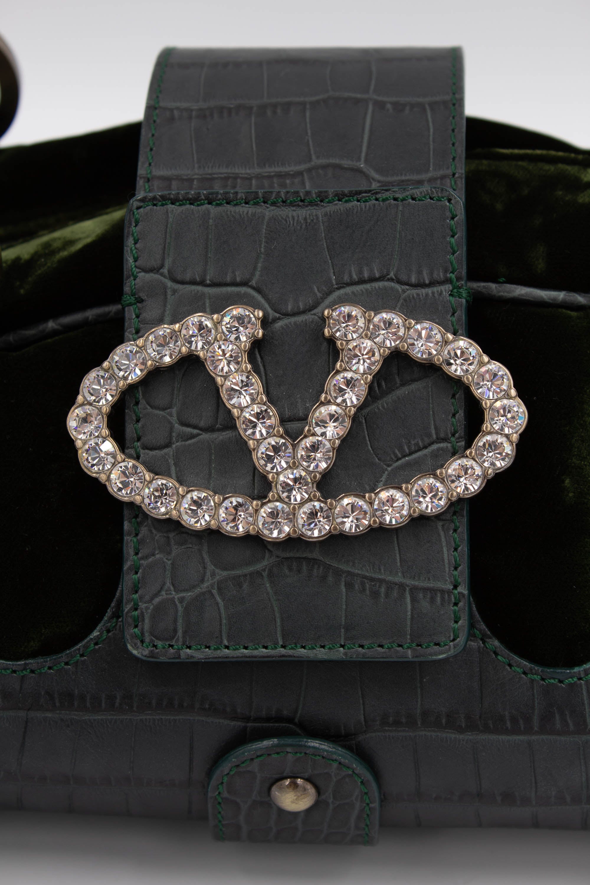 Valentino Green Leather and Velvet Purse Crystal V Logo 2009-10. Embossed leather accents and handles in croc pattern. Main body of bag is deep green velvet. Large Strass crystal embellished V hardware on strap. Magnetic snap with zipper closure.