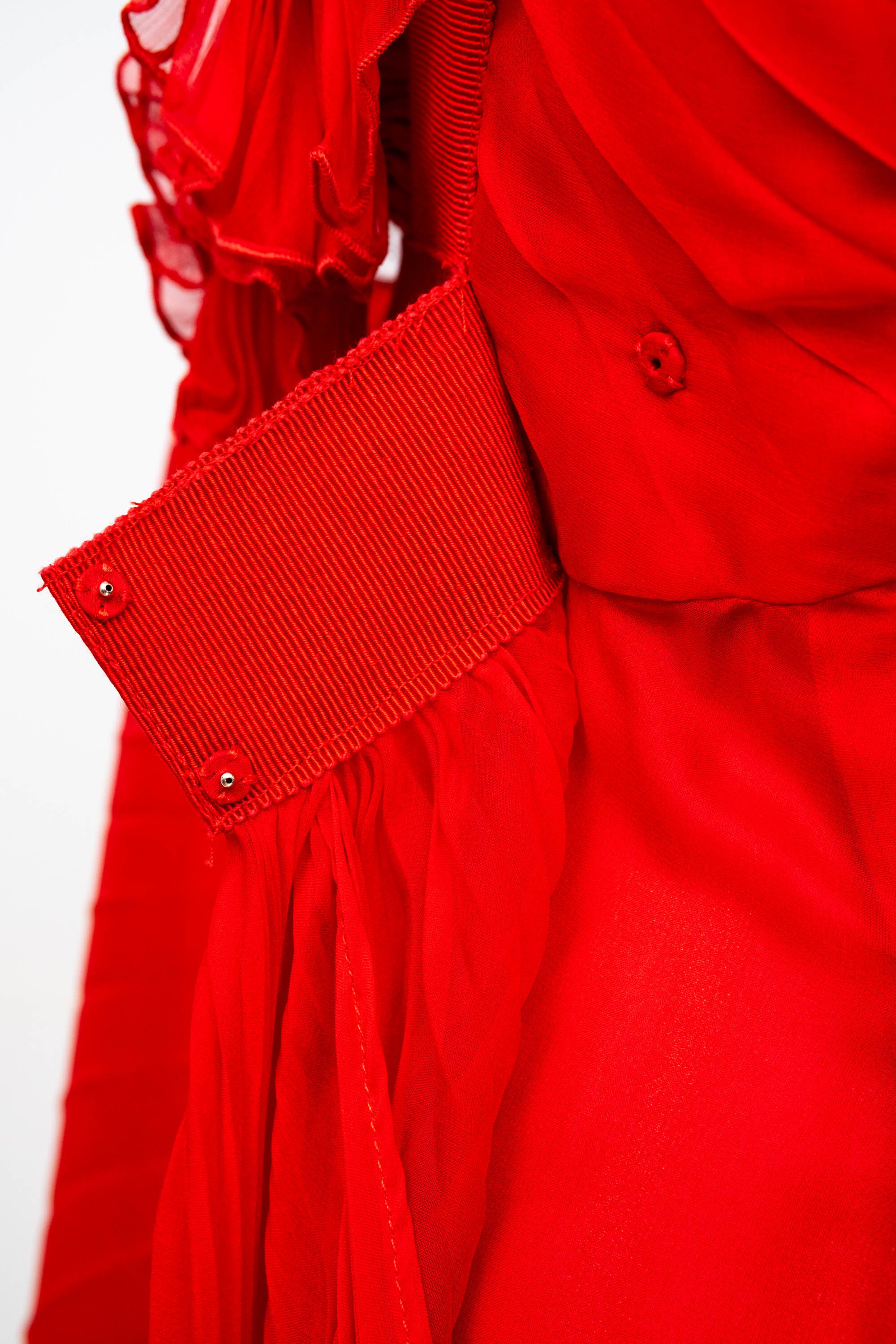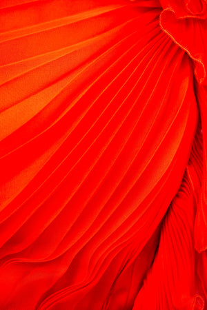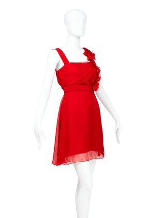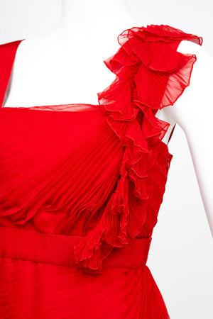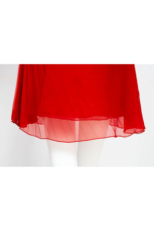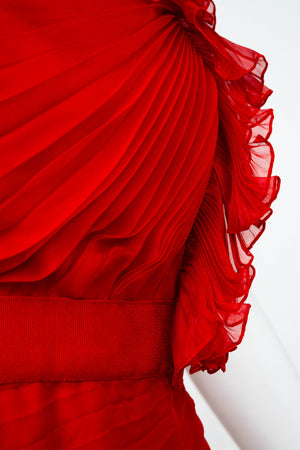 Valentino Red Chiffon Pleated Mini Dress Size 6. Vibrant Valentino red dress in chiffon. One-shoulder silhouette with soft ruffle detail. Fluid pleating with light movement. Romantic mini length. Perfect statement dress for evenings out!